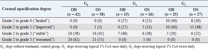 AbstractBackground: Crystalline corneal dystrophy (CCD) is the most common type of corneal lipidic deposition in dogs. CCD is a primary metabolic disorder of the corneal fibroblast featuring an accumulation of extracellular and intracellular lipid deposits. Corneal lipid deposits create a corneal opacity and modify the interfibrillar collagen distance, inducing light scattering. Corneal vascularization is not usually associated with the disease, but, in case of chronicity, cell death may produce inflammation, and new corneal vessels are developed. To the best of the authors’ knowledge, this is the first report of a medical approach for CCD treatment in veterinary medicine. Aim: To evaluate the efficacy of topical 1% cyclosporine eyedrops (1% CsA) for the treatment of CCD in dogs. Methods: Medical records of dogs with CCD were retrospectively reviewed (2009–2020). Corneal opacification description (COD) [size (mm), depth, and opacification degree (0–3)] was evaluated at 0, 3, 6, 9, 12, and 15 months postinitial diagnosis. Dogs were classified into three groups: the control group (G0), the group receiving topical 1% CsA once per day (G1), and the group receiving topical 1% CsA twice daily (G2). Results: Ninety-two client-owned dogs (163 eyes) of different breeds, ages, and gender fulfilled the inclusion criteria. When compared to G0, where the eyes significantly increased COD (p < 0.001), G1 and G2 significantly decreased COD (p < 0.001). In fact, the probability of reducing COD was about three times higher in G2 than in G1, being nearly the same for the right [odds ratio (OR)=2.94; 95% confidence interval (95% CI)=0.55–15.78] and left eye (OR=2.92; 95% CI=0.49–17.26). In addition, for each additional month of treatment in G2, the probability of reducing COD increased significantly (OR=1.12; 95%CI=1.00–1.26 for the right eye and OR=1.16; 95%CI=1.02–1.32 for the left eye). Conclusion: Long-term treatment with topical 1% CsA eyedrops significantly improved CCD in dogs, being the probability of reducing COD higher when applying the treatment twice daily. Keywords: Cornea, Cyclosporine, Deposits, Dog, Dystrophy. IntroductionCrystalline corneal dystrophy (CCD) is the most common type of corneal lipidic deposition in dogs (Barsotti et al., 2008). CCD is a primary metabolic disorder of the corneal fibroblast featuring an accumulation of extracellular and intracellular lipid deposits (Barsotti et al., 2008). Some purebreds (e.g., Beagle, Siberian Husky, and Cavalier King Charles Spaniel) are prone to suffer from CCD, which tends to affect young dogs and both eyes more frequently (Spangler et al., 1982; Cooley and Dice, 1990; Crispin, 2002). CCD is characterized by metallic and refracting opacities in the central or paracentral cornea, with different shapes (i.e., oval, round, discoid, or ringlike lesion) (Whitley and Ralph, 2021). Corneal lipid deposits create a corneal opacity and modify the interfibrillar collagen distance, inducing light scattering. Corneal vascularization is not usually associated with the disease, but, in case of chronicity, cell death may produce inflammation, and new corneal vessels are developed (Crispin, 2002). Schnyder’s crystalline stromal dystrophy is a very similar condition described in humans. Histochemical and ultrastructural studies in both species have pointed to the presence of cholesterol, cholesterol ester, and phospholipids in the affected cornea as responsible for the structural disorganization of corneal collagen fibers. However, a definitive relationship between dyslipoproteinemia has not been found in dogs’ or humans’ disease (Winder, 1994; Crispin, 2002). In dogs with CCD, subtle defects in vision are difficult to assess and confirm. Nonetheless, scientific reports in humans have asserted that photopic vision impairment is caused by the glare from corneal crystalline deposits, with some patients requiring lamellar or penetrating keratoplasty (Jayne, 2009). Lamellar keratectomy in dogs with CCD is recommended only as a last-resort option if the opacity significantly obstructs vision since the corneal deposit is likely to recur with time. To date, no medical treatment has been shown to decrease or eliminate the opacity in CCD (Whitley and Ralph, 2021). Cyclosporine A (CsA) is a cyclic peptide commonly used to treat immune-mediated keratoconjunctivitis sicca in dogs due to its lacrimostimulant and lacrimomimetic properties, improving corneal transparency by reducing corneal vascularization and pigmentation. CsA also disrupts immune-mediated processes by preventing T-cell production. Besides its lipophilic nature, CsA enhances epithelium absorption into the corneal and conjunctival areas (Whitley and Ralph, 2021). In addition, CsA has been shown to stimulate mucin production, secreted by conjunctival goblet cells, on the ocular surface (Phillips et al., 2000; Moore et al., 2001). Importantly, the safety of topical CsA, in a solution of 80% pure vitamin E (DL-α-tocopherol acetate, racemic mixture) and 20% medium-chain fatty acids, has been established previously in dogs and cats (Arteaga et al., 2021). The purpose of the present study was to evaluate the efficacy of topical 1% cyclosporine eyedrops (1% CsA) for the treatment of CCD in dogs. Materials and MethodsMedical records of dogs diagnosed with CCD at two referral veterinary ophthalmology centers, Eye Clinic Anicura Visionvet (San Giovanni in Persiceto, Italy) and Veterinary Teaching Hospital of the Autonomous University of Barcelona (Bellaterra, Spain), from 2009 to 2020, were retrospectively reviewed. Full approval from the hospitals to use the medical record information was obtained. Only dogs diagnosed with CCD after a complete ophthalmic examination, with Schirmer tear test 1 (STT-1) values >15 mm/minute, no sign of ocular discomfort, a minimum follow-up of 3 months, and with digital photographic records, were included in the study. Exclusion criteria included concomitant system