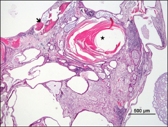 Fig. 3. Cystic mass with differentiation into stratified epithelium with accumulation of laminated keratin (*) and bone (arrow) (H&E).