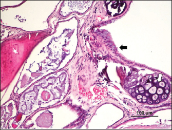 Fig. 4. Bone (*), cartilage (white arrow), and respiratory epithelium (black arrow) (H&E).
