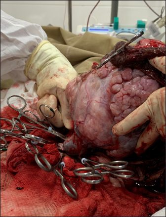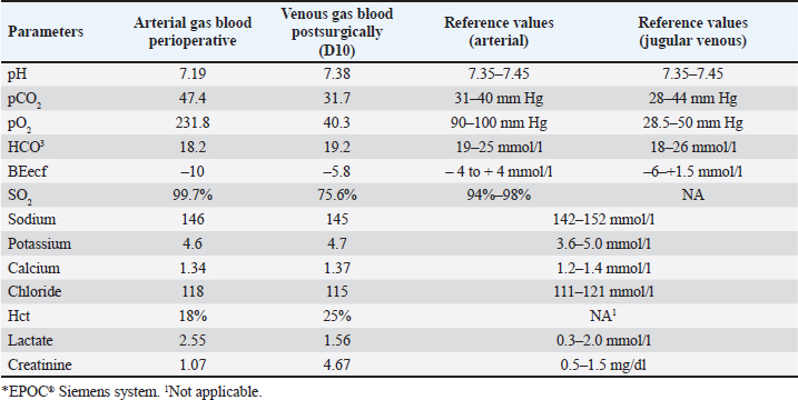 Fig. 1. Exploratory laparotomy in a mixed-breed dog showing a large mass measuring approximately 12 cm in the largest tumor diameter in the left abdominal region over the left hepatic lobe or mesenteric site. Blood gas analysis was performed perioperatively from the dorsal metatarsal artery on the left hind limb (arterial) and 10 days after surgery through the jugular venous blood (venous) (Table 2). Arterial blood gas results in metabolic acidosis and respiratory acidosis, categorizing a mixed acid-base disturbance, since the compensatory response for primary metabolic acidosis is respiratory alkalosis. The presence of hypercapnia, defined as a PCO2 greater than 42 mmHg, could suggest hypoventilation/decreased tissue perfusion (lactic acidosis) that was treated by increasing effective alveolar ventilation in addition to supplemental oxygen, with hemodynamic stability optimized to resolve hypercapnia secondary to poor pulmonary perfusion, including whole-blood transfusion. After surgery, the patient was discharged on enrofloxacin (5 mg/kg, twice daily, per os [PO] for seven days), meloxicam (0.1 mg/kg, once daily, PO for five days), tramadol hydrochloride (5 mg/kg, q 8 h, PO for five days), dipyrone (25 mg/kg, q 8 h, PO for five days), and omeprazole (1 mg/kg, twice daily, PO for seven days). One week following unilateral left ureteronephrectomy, azotemia was observed (creatinine 4.1 mg/dl [RI: 0.5–1.5 mg/dl] and urea 203 mg/dl [RI: 15–65 mg/dl]), and treatment with intravenous fluid therapy (Lactated Ringer’s solution) was administered for one week at a maintenance fluid rate of 2 ml/kg/hr. Unfortunately, a complete urinalysis was not performed in the clinic to fully stage the patient for possible chronic kidney disease. Afterward, creatinine decreased to 3.0 mg/dl (RI: 0.5–1.5 mg/dl) and urea to 130 mg/dl (RI: 15–65 mg/dl), and the patient was discharged. In the last parameter (D120) during follow-up, the creatinine level was 2.3 mg/dl (RI: 0.5–1.5 mg/dl), and that of urea was 68 mg/dl (RI: 15–65 mg/dl) (Table 1). The owner did not notice any abnormalities in the patient’s urine at home. The patient was rechecked monthly for hematological and renal abnormalities after being placed on a renal diet. The owner refused adjuvant chemotherapy. The patient was active and had gained weight during the three months of follow-up. Table 2. Canine blood gas parameters in the perioperative and postsurgical analysis*.