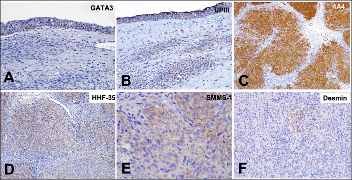 Fig. 3. Photomicrographs of a canine ureteral leiomyosarcoma. (A) Positive staining for GATA3 in normal urothelial mucosa in the ureter, 20x. (B) Staining for UPIII in normal urothelial mucosa in the ureter, 20x. (C) Positive staining for alpha-smooth muscle actin (1A4) in neoplastic cells, 10x. (D) Positive staining for muscle-specific actin, 10x. (E) Positive staining for smooth muscle myosin heavy chain, 40x. (F) Scatted positive staining for desmin, 10x. IHC, Harris hematoxylin counterstaining.