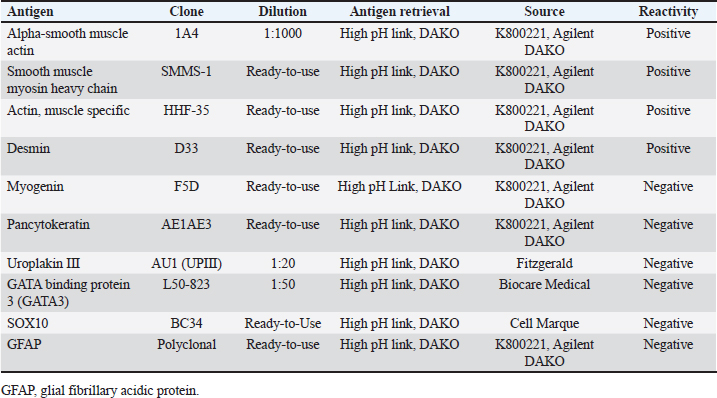 Histopathology revealed that the left kidney had glomerular capsule thickening, discrete and multifocal interstitial lymphocytes, moderate tubular dilation, a small number of hyaline casts, and a slight amount of tubular calcification. No neoplastic cells were observed. In addition, the large mass was characterized by diffuse malignant neoplastic mesenchymal cell proliferation with necrotic areas arranged in dense bundles separated by the stroma (Fig. 2). The cells exhibited moderate anisocariosis with evident nucleoli. The cells were characterized by an eosinophilic cytoplasm, poorly delimited, and sometimes vacuolated with round to oval nuclei, loose chromatin, and small evident nucleoli. A low mitotic index (two mitoses in 10 high-power fields) was also observed. An immunohistochemistry (IHC) panel was also performed to further characterize the tumor, showing positivity for alpha-smooth muscle actin (1A4), smooth muscle myosin heavy chain (SMMS-1), and muscle-specific actin (HHF-35), and scattered positive staining for desmin (D33). Positive staining for GATA3 and UPIII was observed in the normal urothelial mucosa of the ureter. In conclusion, primary ureteral leiomyosarcoma was confirmed, and the neoplastic cells were negative for myogenin, pancytokeratin, uroplakin III, GATA-binding protein 3, SOX10, and Glial fibrillary acidic protein (GFAP) (Table 3 and Fig. 3).