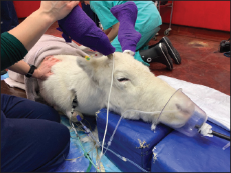 Fig. 2. Elevation of the patient’s head on soft padded blocks, in addition to mask oxygen supplementation and monitoring with ECG, capnography, and pulse oximetry. The cephalic intravenous catheter can be seen in the front right forelimb with a three-way tap connecting the medetomidine infusion and intravenous fluid therapy.