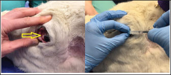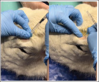 Fig. 5. Infiltration of the infratrochlear nerve block, the yellow arrow pointing to the palpable infratrochlear notch. Local anesthetic blocks were administered for the provision of analgesia and to facilitate third eyelid removal by blocking the palpebral reflex. Mepivicaine at a dose of 2 mg/kg was chosen. The supraorbital nerve block was performed by palpating the frontal nerve as it travelled through the supraorbital foramen located at the dorsolateral orbital rim, 1 ml of mepivacaine 2% was injected (Fig. 3). The auriculopalpebral nerve block was performed by palpating the nerve as it traversed horizontally over the dorsal most ridge of the zygomatic process of the temporal bone, 2 ml of mepivacaine 2% were injected just dorsal to the zygomatic arch and rostral to the base of the ear (Fig. 4). The infratrochlear nerve block was performed by palpating the infratrochlear notch at the medial canthus, 1 ml of mepivacaine 2% was then injected aiming medially beneath the orbital rim (Fig. 5). Local infiltration of the base of the third eyelid in the region that was not macroscopically affected by the neoplastic change was performed with 2 ml of mepivacaine 2%. A 2 ml splash block of the ocular surface was performed using lidocaine 2% and epinephrine 1:200,000. Lubricant using carmellose sodium (Celluvisc 1%) was applied to both eyes every 30 minutes until the palpebral reflex was regained. Physiological parameters remained within acceptable limits. Mild bradycardia at 32 beats per minute (bpm) was documented before the cessation of medetomidine infusion, pre-anaesthetic heart rate was 60 bpm. Mean arterial non-invasive blood pressure remained between 90 and 105 mmHg. Respiratory rate was stable between 12 and 19 breaths per minute maintaining an end tidal carbon dioxide between 40 and 50 mmHg. Pulse oximetry was >98% throughout the procedure. The temperature remained stable between 38.2 and 38.4 degrees Celsius. The surgical procedure consisted of aseptic preparation of the periocular region using 1:10 diluted iodine and flushing of the conjunctival sack using 1:50 diluted iodine over 3 minutes followed by a 10 ml saline flush. The patient was subsequently draped and a lidocaine/adrenaline splash block of 2 ml was applied to the ocular surface. The base of the third eyelid was clamped and sharply excised anterior to the haemostats. Following release minimal haemorrhage and mild orbital fat prolapse in the region of the medial canthus occurred. The orbital fat was repositioned and the entire surgical wound was closed with a continuous inverting suture pattern using 6-0 Vicryl. Adjunctive cryotherapy was performed using the Cryo-Alfa Super handheld cryosurgery unit. N2O gas cryospray was applied to the surgical incision site and the surrounding conjunctiva in two cycles of freezing and thawing. During this surgical step, the cornea was protected with lubricating carmellose sodium eye drops (Celluvisc 1%) and a surgical drape. Histological examination of the mass confirmed a squamous cell carcinoma with no evidence of vascular invasion. The neoplasm was fully excised with the narrowest histological margin measuring 4 mm. Upon completion of the procedure, medetomidine was antagonized with atipamezole, and a total of 70 ug/kg was given. This was administered in two boluses, 35 ug/kg intramuscularly and then 15 minutes later 35 ug/kg intravenously. After 30 minutes the reindeer was standing although she remained mildly ataxic and dull for a further 2 hours. She was perceived to be quiet for 12 hours after surgery. She was discharged the next day with ongoing oral meloxicam (Metacam®) 0.5 mg/kg q 48 hours, topical gentamicin sulphate 3.0 mg/ml eye drops (Tiacil®) q 8 hours, and bromfenac sodium sesquihydrate 0.9 mg/ml eye drops (Yellox®) q 8 hours. At 24 hours follow up there was mild to moderate blepharospasm and mild mucoid ocular discharge. The surgical wound looked unremarkable, no suture material was visible and there was no evidence of corneal ulceration. The conjunctiva surrounding the surgical site was markedly hyperaemic and chemotic. DiscussionFew studies describe the anesthetic management of reindeer. The combination of medetomidine and ketamine has been investigated for the immobilization of captive reindeer (Rangifer tarandus tarandus) (Ryeng et al., 2001a). They concluded a 100 ug/kg medetomidine in combination with 0.5 mg/kg ketamine via intramuscular injection was sufficient for induction of anesthesia. This dose of medetomidine is significantly higher than was required for the reindeer in our case report. This likely reflects the different pharmacological requirements for different subspecies of reindeer, in addition to the significant effect of domestication. Moreover, reindeer are reported to have seasonal variation in their resting metabolic rate; some papers reference a reduction of up to 30% in winter months (Nilssen et al., 1984). This may contribute to reduced drug elimination. However, pharmacokinetic studies are yet to prove this theory (Ranheim et al., 1997). Our case represents a very well-domesticated animal accustomed to frequent handling. The importance of environmental surroundings is evidenced by significantly higher drug doses being required when darting the same animals in an outdoor compared to an indoor environment (Ryeng et al., 2001a). Further, it is described that when the animals were in a paddock they were more easily disturbed and stressed than when already restrained. The same paper discusses the significantly increased levels of stress and excitement demonstrated in free-ranging reindeer when approached by humans, compared to captive animals. In addition to the effect these catecholamines have on the efficacy of anesthetic drugs, an investigation into impala capture identified the greatest influence on cardiovascular parameters was the duration of the exposure to stress, not the pharmacological agents used (Meyer et al., 2008a). This highlights th