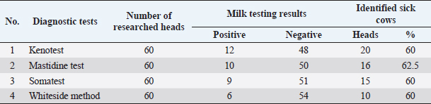 AbstractBackground: Mastitis is a disease of productive cows, widespread throughout the world, and characterized by significant economic damage to the dairy industry. The subclinical form of this disease is aggravated by additional difficulties with its diagnosis and the lack of clear treatment protocols. Aim: Therefore, the study of the effectiveness of diagnostic studies and the search for new methods of treatment of latent forms of mastitis is an important direction in scientific research in countries with developed dairy cattle breeding. Methods: Studies conducted on the number of dairy cows of the production cooperative “Izhevsky” of the Akmola region of the Republic of Kazakhstan showed that when using rapid tests Kenotest, Somatest, Mastidine test, and Wideside test, the same results were obtained when the disease was detected in cows. The effectiveness of the tests was at the level of 60%–62% when using the settling sample as a control. Medical procedures were carried out using the Aquaton-2 microwave radiation apparatus and a homeopathic preparation. When using physiotherapy with microwave radiation, a decrease in the level of microbial contamination of milk from the treated part of the udder by 1.5–5 times was observed. Results: Biologically active substances of plant origin in the homeopathic preparation, due to the immunostimulating effect, made it possible to increase the level of γ-globulins in the blood serum of sick animals during the application. Conclusion: The complex use of both methods in the treatment of animals with a subclinical form of mastitis made it possible to reduce the level of somatic cells in the milk of the affected udder lobe to a level that cannot be determined using Kenotest in 4–6 days, which is 2–4 days faster than using these methods separately. Keywords: Somatic cells, Physiotherapy, Biochemical indicators, γ-globulins, Diagnostic tests. IntroductionThe main task of the national food program of any country is to provide the population with high-quality and safe food products, including those of animal origin. Therefore, control over the productive health of animals from which raw materials for food production are obtained and constant monitoring of product quality is a paramount task for all links of veterinary and sanitary control, both at the stage of obtaining raw materials and at the stage of production of finished products. Milk and dairy products have always been one of the key foods in the human diet. They contain almost all the necessary elements in an easily accessible form for the normal functioning of the human body. However, this is true only for high-quality products, while low-quality milk or products made from it, on the contrary, can harm the health of the consumer (Dikhanbayeva et al., 2019). Mastitis, a widespread disease, leads to a reduction in milk quality and renders it generally unsuitable for consumption due to inflammation of the mammary gland, which causes physicochemical changes in milk and pathological changes in the udder parenchyma. This disease is common mainly among dairy cows and can occur regardless of the season of the year or the stage of lactation, the conditions of keeping, or the breed of animals (Zhumanov et al., 2015). The causes of its occurrence are also very diverse from infectious diseases to non-compliance with elementary hygiene rules when preparing cows for milking. Such diverse causes lead to the widespread of this disease among the population of dairy cows in the Republic of Kazakhstan (Kelm, 2021). The problem of cows with mastitis is also exacerbated by the fact that, compared with clinical mastitis, which is easy to identify by a set of signs and treat promptly, the subclinical form of mastitis occurs much more often among livestock and, according to some authors, causes more economic losses of dairy cows industry (Kumari et al., 2018; Chuzhebayeva et al., 2021; Ranasinghe et al., 2021). Diagnosis of the subclinical form of mastitis in cows is difficult due to the lack of clinical signs of the disease and it can be detected only by applying additional laboratory methods (Proshutinskaya and Neverova, 2019). The main changes occur in the quantitative and qualitative composition of milk—this is an increase in the number of somatic cells, an increase in the acidity of milk, and a decrease in the amount of casein, lactose, and other components of milk (Kandeel et al., 2019; Leitner et al., 2019; Antanaitis et al., 2021). The most problematic links in the treatment of subclinical mastitis are the timely diagnosis of the disease in the conditions of the production process and the use of effective approaches to eliminate the inflammatory process in the mammary gland of a productive animal. For diagnostics, several approaches are used, the action of which is based on the principles: counting the number of somatic cells—microscopically (Mustafin and Volkov, 1984; Robles et al., 2021) and cytological method (Zecconi et al., 2019; Zhelavskyi, 2021; Rienesl et al., 2022), microbiological examination of milk (Adkins and Middleton, 2018), electrical conductivity (Ebrahimie et al., 2018), the concentration of hydrogen ions (pH) (Kandeel et al., 2019), breast thermography (Velasco-Bolanos et al., 2021), and rapid tests based on visual effects (Kandeel et al., 2018; Sinha et al., 2018; Nagasawa et al., 2020). Diagnostic tests are the most widespread in production conditions. This is due to the simplicity of the analysis and the rapid accounting of the results of the study. Of the most well-known tests that are used on farms, they use the California test, Masttest, Ecotest, KerbaTest, Kenotest, ReagentN, and a number of others. The action of rapid tests is based on a change in the viscosity of milk, with a high content of somatic cells, under the action of a reagent. The composition of the reagent includes components that cause cell lysis and a pH indicator. As a substance that destroys the membr