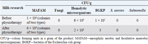 Table 2. The content of microflora in the milk of cows of the control group after treatment of the udder using the Aquaton-2 device.