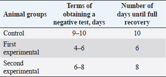 Fig. 5. The number of colonies grown on MPA before and after the physiotherapy procedure. Table 4. Terms of recovery of cows of the control and experimental groups.