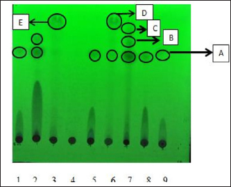 Fig. 1. Chromatogram of TLC results with UV lamp on Lambda 254 and 366 nm. (1) Methanol extract; (2) ethyl fraction acetate; (3) fraction n-hexane; (4) water fraction; (5) fraction butanol; (6) fraction C1; (7) C2 fraction; (8) C3 faction; and (9) C4 fraction.