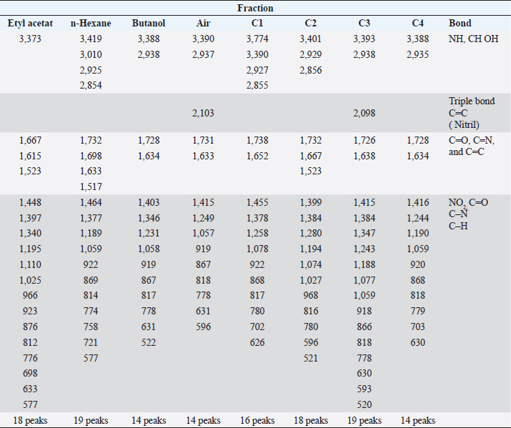 Table 5. Wavenumber (cm−1) of several extract fractions of S. cumini L.