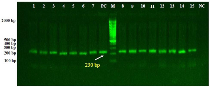 Fig. 2. Electrophoresis of PCR products in 1.5% agarose gel to detect amplified DNAs of B. burgdorferi targeting 16S rRNA gene. While Lane M: Ladder marker (100–2,000 bp); Lane PC: Positive control, Lane NC: Negative control, Lanes 1–12: Positive samples of B. burgdorferi at 230 bp. DiscussionSeveral worldwide studies attempted to identify or isolate Spirochetes and B. burgdorferi from different samples (blood or joint and cerebrospinal fluids) of patients, which often failed due to the low number of organisms found in tested samples, lack of ideal culture conditions, long time consumed, and excessive laboratory steps in addition to the risk of infection of transmission for workers. In the last decades, molecular techniques have been provided highly sensitive, specific, and safe alternative tools for the diagnosis of agents such as Spirochetes and B. burgdorferi in humans and animals (Straubinger et al., 1997; Straubinger, 2000; Coulter et al., 2005; Anthony et al., 2013; Bil-Lula et al., 2015). Duhamel et al. (1998) confirmed that the large intestines of dogs, like those of humans and other animals, including birds, are colonized by more than one species of spirochete. The present study reported that the prevalence rate of B. burgdorferi in dogs by PCR assay was 29.09%. In other studies, there were 0.1%–17.3% in Mexico (Solís-Hernández et al., 2018; Bedoya et al., 2023), 0.4%–40% in Croatia (Poljak et al., 2000; Jurković et al., 2019), 0.6% in Romania (Cazan et al., 2020), 0.9% in China (Wang et al., 2018), 1.09% in France (Pantchev et al., 2009), 1.47% in Italy (Ebani et al., 2014), 2.049% in Latvia (Berzina and Matise, 2013), 2.4%–74.5% in Bulgaria (Angelov et al., 1993; Pantchev et al., 2015), 2.8%–45.3% in Slovakia (Stefancikova et al., 1996; Čabanová et al., 2015), 3.75%–33.7% in Poland (Skotarczak et al., 2005; Cardoso et al., 2012), 6.4% in South Korea (Lee et al., 2020), 6.5%–53.7% in Czech Republic (Sýkora et al., 1990; Pejchalová et al., 2006), 9.52% in Iran (Mosallanejad et al., 2015), 10.2%–27.3% in Japan (Arashima, 1991; Uesaka et al., 2016), 16.8% in Sweden (Egenvall et al., 2001), 17% in Netherlands (Goossens et al., 2001), 21% in Spain (Amusategui et al., 2008), 38.22% in Turkey (Altug et al., 2022), 23–56.9% in USA (Guerra et al., 2000; Wagner and Erb, 2012), 25.81% in Serbia (Savić et al. 2010), 31.3% in Brazil (Nascimento et al., 2016), and 35.5% in Germany (Barth et al., 2012). This variation confirmed that the prevalence rate of B. burgdorferi in dogs is different between regions, countries, and years, which might be attributed to the diagnostic method used, the presence of vectors as ticks, geographical characteristics, consequence of environmental factors, and diversity in the epidemiology of infection.