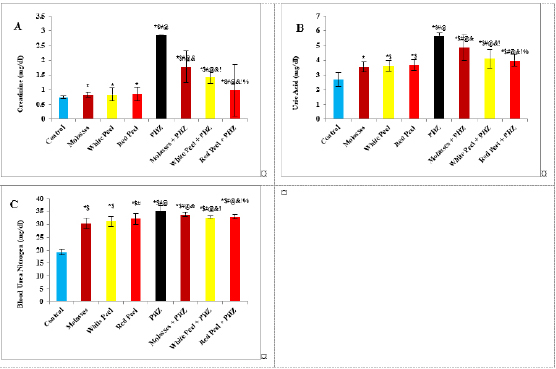 Fig. 3. Effect of oral administration of molasses extract, white peel pomegranate extract, and red peel pomegranate extract to control or PHZ rats both at 25 mg/kg/day for 2 weeks on (A) Creatinine (mg/dl). (B) Uric acid (mg/dl). (C) BUN (mg/dl). Results are expressed as mean ± SEM (n=8 for all groups). * p < 0.05 when compared to the corresponding control values, $ p < 0.05 when compared to the corresponding molasses values, # p < 0.05 when compared to white peel values, [at] p < 0.05 when compared to red peel values, and p < 0.05 when compared to PHZ values, ! p < 0.05 when compared to molasses+PHZ values, %p < 0.05 when compared to white peel+PHZ values; using one-way ANOVA followed by Tukey’s post-hoc test. Histopathological observationsHistopathological changes in renal tissues in the different groups treated are shown in Figure 5. PHZ exposed group showed disorganization and spread of necrosis throughout the renal parenchyma with severely damaged glomeruli, damaged and lobulated glomerulus (G) with intra-glomerular hemorrhage and widened Bowman’s space, damaged and necrotic proximal and distal convoluted tubules (DCT) furthermore, highly destructed proximal and DCT with hyaline proteinaceous material. Pomegranate pure-treated groups showed nearly normal renal parenchyma containing G and proximal convoluted tubules (PCT) with good profile and regular Bowman’s space except for some sort of thickening in the parietal layer of Bowman’s capsule. PHZ co-treated groups with permanganate showed good renal parenchyma; G, PCT, and DCT, but the G still contained sclerosis together with damaged renal nuclei. DiscussionPomegranate has extensively been used in folk medicine for several purposes. Recently, studies have shown that pomegranate has several pharmacological activities such as antimicrobial (Akpinar-Bayizit et al., 2016), antioxidant, anti-inflammatory, and anticarcinogenic effects (Ahmed and Ali, 2010). Pomegranate–derived products have shown beneficial effects on the treatment and prevention of various diseases such as cancer, cardiovascular disease, neurological disorders diabetes, and other diseases. The kidneys are easily susceptible to damage from drugs because of larger perfusion and accumulation of excreted compounds that occur in renal tubular cells during absorption and secretion. In the current study, it was observed that PHZ induced a reduction in renal function, which improved in pomegranate co-treated groups. Phenols and flavonoids, which have antioxidant activities have been shown to be very important plant constituents. The plant phenolics are commonly present in fruits, vegetables, leaves, nuts, seeds, barks, roots, and other plant parts. Pomegranate is an important source of vitamin C. The antioxidant and free radical scavenging activities of pomegranate phenolic compounds and vitamin C have been reported. It appears that PE has affected the glomeruli in the cortex more than other parts, so the flavonoids - containing compounds might cause vasodilation and increase blood flow in the kidney (Kumar et al., 2011). In addition, it was reported that polyphenolic compounds could elevate nitric oxides (NOs) that increase blood flow. This increased blood flow can also influence glomeruli and increase the size of the glomeruli. This could be a main factor in increasing the weight, volume density, and volume of the cortex, the volume density of glomeruli, and the total volume of glomeruli (Mansouri et al., 2016).