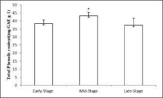 Fig. 1. Effect of different maturity stages on TPC of ethanolic okra fruit extracts. The results are representative of at least three independent experiments and are expressed as mean ± SEM (n=5). (*): Significant differences between treatment groups (p < 0.05).