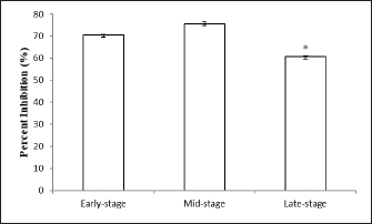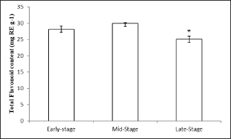 Fig. 2. Effect of different maturity stages on TFC of ethanolic okra fruit extracts. The results are representative of at least three independent experiments and are expressed as mean ± SEM (n=5). (*): Significant differences between treatment groups (p < 0.05). In fact, the TPCs and TFCs of okra fruits were significantly influenced by their ripening process. While the mid-ripe ethanolic extract of A. esculentus L. fruits contained the highest phenolic and flavonoid contents. DPPH radical-scavenging activityIn the present research, the antioxidant activity of okra was determined using the DPPH method. The results are highlighted in Figure 3. As regards, the percent inhibition of fruit extracts was determined. As shown in Figure 3, all ripening stages of okra fruits have a major anti-radical effect. In addition, the extract capacity was dependent on the maturation stage. Furthermore, the antioxidant capacities of okra fruits contribute partially to the health amelioration (Xia et al., 2015). The antioxidant capacities of okra fruit extracts were ranged from 60.7% ± 0.26% to 75.64% ± 0.79%. Wahyuningsih et al. (2021) suggested also that the ethanolic extract of red okra fruits has an important percent inhibition via the DPPH test.