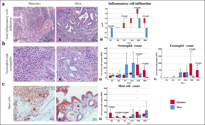 Fig. 2. The numbers of various types of inflammatory cells (total inflammatory cells, neutrophils, eosinophils, and mast cells) infiltrate the biliary area of hamsters and mice infected with O. viverrini from D1 to D56 p.i. The different types of inflammatory cells are located in the biliary and peri-biliary areas of hamsters (ai, bi, ci) and mice (aii, bii, cii), respectively. The graphs on the right comparatively show the grade of inflammatory cells between both groups (aiii). Early response of inflammation is present in the mice model while the chronic response is shown in a hamster model. Quantitative comparison of the individual white blood cells, including neutrophil (biii), eosinophil (biv), and mast cell (ciii) showed significantly different among OV-infected hosts (p < 0.05). (a–bi, a–bii=H&E; ci–cii=alcian blue-safranin O, original magnification, ai-aii=× 20, scale bar depicts 50 μm; b–ci, b–cii=× 40, scale bar depicts 20 μm).