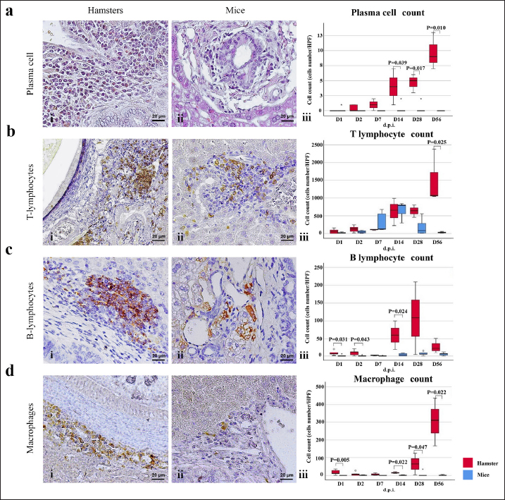 Fig. 3. Comparison of different mononuclear cell types (plasma cells, T lymphocytes, B lymphocytes, and macrophages) that infiltrate the portal area in hamsters and mice infected with O. viverrini. The micrographs represent the different types of inflammatory cells in hamsters (a-di) and mice (a-dii). A comparison of each individual inflammatory cell, including plasma cell (aiii), T-lymphocytes (biii), B-lymphocytes (ciii), and macrophages (diii) are represented by graphs (right column). Mice show the early and minimal response of these mononuclear cell infiltration, while hamsters display a significantly larger and later response (p < 0.05) (a–diii). (ai–aii=H&E; b–di to b–dii,=immunohistochemistry, original magnification, a–di, a–dii=× 40, scale bar depicts 20 μm). Infiltration of plasma cellsThe number of plasma cells, which differentiate from B cells, was rarely detected in mice, whereas the cells gradually increased from D2 to D56 in hamsters (Fig. 3ai and ii). A significant difference in plasma cell numbers between mice and hamsters was found on D14 (p=0.039), D28 (p=0.017), and D56 (p=0.010) (Fig. 3aiii). Infiltration of macrophagesMacrophages are one of the cell types included in the mononuclear cell population. In this study, immunohistochemical techniques were used to demonstrate macrophages in general, without distinguishing between specific types. The results showed that macrophage presence was more prominent in the hamster model (Fig. 3di and ii), especially in the chronic phase on D28 and D56. The hamster model showed significantly higher macrophage infiltration than the mouse model throughout all periods (p < 0.05) (Fig. 3diii). Periductal fibrosisPDF was graded semi-quantitatively according to the criteria described in Table 1. The fibrosis was mainly observed in the first-order bile ducts where O. viverrini was present, but it was rarely seen in the second-order bile ducts. The fibrous tissue presented from periductal tissue of large portal areas which observed on D7 in hamsters and extended to small portal triads in chronic infection on D56 (Fig. 4). Compared to the mouse model, PDF increased significantly in D14 (p=0.008). Correlation between PDF grades and different types of inflammatory cell infiltrationSpearman’s rank-order correlation was used to assess the relationship between PDF and various types of inflammatory cells infiltrating the biliary epithelium (Table 3). Significant correlations were mostly found in the hamster group. In the hamster model, a very strong positive correlation was observed between PDF and eosinophils (rs=0.806, p=0.000), T-lymphocytes (rs=0.838, p=0.000), and plasma cells (rs=0.876, p=0.000), with a strong positive correlation observed with neutrophils (rs=0.633, p=0.002), mast cells (rs=0.667, p=0.001), mononuclear cells (rs=0.631, p=0.002), B-lymphocytes (rs=0.520, p=0.013), and macrophages (rs=0.529, p=0.011). In contrast, the PDF in the mouse model showed a strong negative correlation with neutrophils (rs=−0.470, p=0.009) and a moderate positive correlation with B-lymphocytes (rs=0.383, p=0.037). Proliferative lesionsBiliary epithelial proliferative lesions The present study investigated proliferative lesions of biliary epithelial pathology, focusing on two major microscopic lesions: biliary hyperplasia and dysplasia (as shown in Fig. 4). To determine the cell proliferation activity, we performed BrdU immunohistochemistry and calculated the BrdU index. The index was compared between the models and times to assess the proliferation activity. Biliary hyperplasia and bile duct proliferation Histological evaluation of biliary cell proliferation was performed by grading epithelial hyperplasia in the first-order bile duct and bile duct proliferation in the second-order bile duct. Biliary hyperplasia and bile duct proliferation were categorized based on the proliferation, stratification, and mucosal folding of the biliary epithelium or the number of bile ducts per portal area, and graded as shown in Table 1. Hyperplasia was observed in both rodent models infected with OV (as shown in Fig. 4). In the mouse model, the hyperplasia of the first-order bile duct abruptly increased only on D14, while a similar increase was found in the chronic phase (D28). A higher degree of biliary hyperplasia was observed in the O. viverrini-infected hamster (HOV) group on days 1, 2, 28, and 56, while a higher degree of biliary hyperplasia was observed in the O. viverrini-infected BALB/c mouse (MOV) group on days 2, 7, and 14 (as shown in Fig. 4ai–iii). It was found that marked proliferation was rarely present in both models. BrdU proliferation index Semi-quantitative analysis of biliary cell proliferation by BrdU labeling was performed in immunohistochemically stained portions, where positive biliary nuclei were counted (as shown in Fig. 4) and scored as described in Table 1. In hamsters, a higher degree of BrdU index was found in the OV infection groups on D14, D28, and D56 p.i. In contrast, in mice, the higher BrdU index was found in the early period of OV infection groups, specifically on D1 and D2, which then declined in the late period. The HOV group had a significantly higher BrdU index than the MOV group (p=0.024) on D28 and D56 (p=0.024) p.i. On the other hand, the MOV group showed a significant increase in the BrdU index on the first day postinfection compared to the HOV group (p=0.005). In addition, the MOV group had a significant increase in the BrdU index on D2 p.i. compared to the Hams OV group (p=0.009) (as shown in Fig. 4). Biliary dysplasia Biliary dysplasia recognized by hyperplastic and hyperchromatic epithelium with infrequent mitotic figures was shown in the first-order bile ducts. Dysplasia was commonly seen in areas with active inflammation and its occurrence depended on the duration and study groups. In the mouse model, the lesion was detected earlier and peaked on D14. However, the lesion declined and disappeared at D5