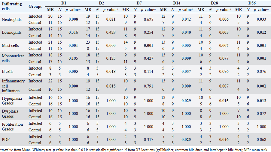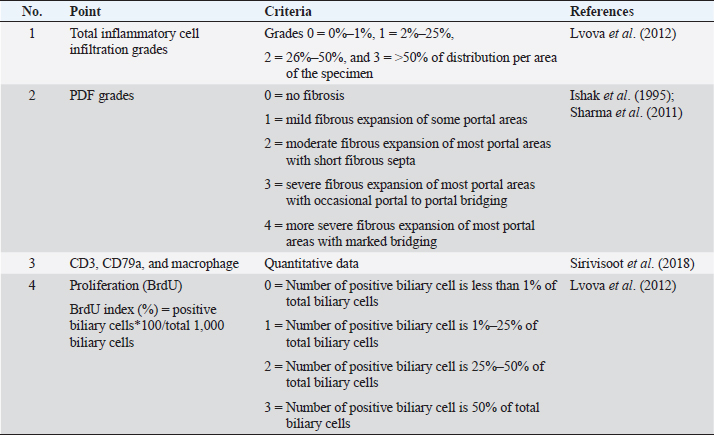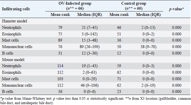 Immunohistochemistry for B lymphocyte (CD79a)Immunohistochemistry was performed to detect B-lymphocytes using CD79a as a marker. The staining protocol was similar to that used for CD3 IHC but utilized EnVision Detection Systems. Tissue sections were incubated overnight at room temperature with monoclonal rabbit anti-CD79a antibody (dilution 1:200, CD79a (D1X5C) XP® Rabbit mAb#13333, Cell Signaling®, USA). The sections were then incubated with EnVision Kit (#K5007-11, EnVision Detection Systems Peroxidase/DAB, Rabbit/Mouse, DAKO®, USA) for 1 hour at room temperature before following the step of color development, counterstain, rehydration, and mounting. Positive and negative control tissues for CD79a expression were normal spleen and liver tissue, respectively. Immunohistochemistry for macrophageThe staining protocol was similar to that used for CD3 and CD79a, but antigen retrieval was performed by heating the tissue in 0.1M EDTA. Tissue sections were incubated with monoclonal rat anti-macrophage antibody (dilution 1:200, ab56297, Abcam plc, Cambridge, UK) overnight at room temperature. After washing, the sections were incubated with goat anti-rat IgG H&L (ab205720, Abcam plc, Cambridge, UK) for 1 hour at room temperature. Positive and negative control tissues were normal spleen tissue from hamsters and mice and normal liver tissue from hamsters and mice, respectively. Immunohistochemistry for cell proliferation (BrdU IHC)At least 30 minutes before euthanasia, the animals were injected with 0.01 mg/ml 5-bromodeoxyuridine (BrdU) intraperitoneally to let the chemicals cooperate to host DNA. The immunohistochemical staining was similar to those in CD3 IHC. deparaffinization and rehydration steps were similar to those previous methods. The primary and secondary antibodies used were polyclonal sheep anti-Bromodeoxyuridine (dilution 1:500, ab1893, Abcam plc, Cambridge, UK), at room temperature overnight. Then, the sections were incubated by biotinylated rabbit anti-sheep IgG (dilution 1:200, ab97130, Abcam plc, Cambridge, UK) for 1 hour at room temperature. Positive and negative controls for BrdU were hamster CCA and normal hamster/mouse liver tissue. Data evaluation and analysisHistopathology evaluation The pathological observation was diagnosed and confirmed by 2 pathologists. The acute phase of infection was defined as days 1, 2, 7, and 14 postinfection with immature O. viverrini, while the chronic phase was defined as days 28 and 56 postinfection with mature worms. Slides were examined for biliary lesions, and the pathological outcomes for each treatment were described qualitatively and graded semi-quantitatively based on the following criteria: inflammation, hyperplasia, and dysplasia of the bile duct or cholangiocyte, which were graded based on a modified grading system from Lvova et al. (2012). Periductal fibrosis (PDF) was also graded based on a modified grading system from Ishak et al. (1995) and Sharma et al. (2011) (Table 1). Immunohistochemical grading The immunohistochemical staining of CD3, CD79a, and macrophage was evaluated using a semi-quantitative grading system modified by Zhao et al. (2020). The grading system was based on the percentage of positively stained cholangiocytes per counted cholangiocytes and the distribution of staining. The percentage of positively stained cells was graded as described in Table 1. The proliferation activity of biliary cells from BrdU immunohistochemistry was modified by Lvova et al. (2012). The conclusion of the criteria in detail is shown in Table 1. Statistical analysisStatistical analysis was performed using SPSS version 26.0 software (SPSS Inc., USA). The Kruskal–Wallis test and Mann–Whitney U test were used to evaluate semi-quantitative variables including the number of mast cells, neutrophils, eosinophils, T lymphocytes, B lymphocytes, and macrophages. For ordinal-level data, the Spearman rank order correlation was used to measure the direction and strength of the association between bile duct inflammatory cells, and PDF grades. A p-value less than 0.05 was considered statistically significant. To account for skewed distributions that have outliers, the interquartile range (IQR) was used as a measure of variance. This measure is based on the middle half of the distribution, which is not affected by outliers. Ethical approvalThe study was approved by the Animal Ethics Committee of Khon Kaen University in accordance with the Ethics of Animal Experimentation of the National Research Council of Thailand (ACUC KKU 78/2561 and 35/2563). ResultsBoth laboratory animal models, representing responsive and nonresponsive models of O. viverrini infection were studied histopathologically. The study focused on two clusters of biliary lesions: types of infiltrative inflammatory cells and biliary proliferative lesions, such as hyperplasia of the first and second order bile ducts, from the beginning of infection to D56 postinfection (p.i.). Before euthanasia, animal feces were collected to confirm the infection status using modified FECT. Stool examination reveals O. viverrini eggs were detected only in the hamster model on D28 (2 of 3, 66.67%) and D56 (3 of 3, 100%). In contrast, no egg was detected in a mouse model during periods. The results revealed that all hamsters and BALB-c mice in both infection and normal control groups showed no abnormal signs. Unfortunately, two hamsters from D28 and D56 died from fighting. A gross examination of the liver in the O. viverrini-infected group showed a slight enlargement. The liver of infected hamsters from D28 and D56 showed a thickening of the bile duct wall. Similarly, the cut surface revealed a thickening of the periductal area in the hepatic parenchyma. The opacity of the common bile duct and gall bladder increased in O. viverrini-infected hamsters on D56, but not in mice. Under the microscope, the infected liver of both animal models showed infiltration of inflammatory cells which was scarcely seen in