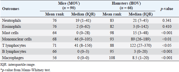 Table S2. Comparison of the mean rank and median interquartile range (IQR) of the infiltrating cell counts from all locations and postinfection days between the OV-infected and control groups of hamster model and mouse model.