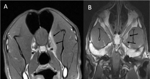 Fig. 2. (A) Transverse and (B) dorsal post-contrast T1-weighted images revealing enhancement of orbital musculature and medial pterygoid muscle (arrows).