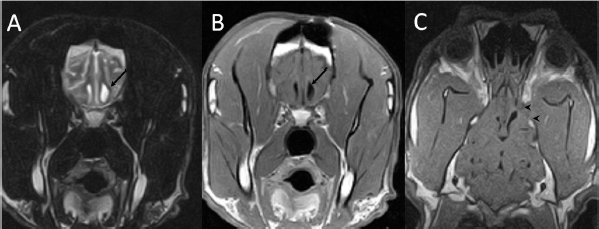 Fig. 5. (A) Transverse T2-weighted, (B) transverse post-contrast T1-weighted image, and (C) dorsal post-contrast T1-weighted image obtained 6 months after surgery. Note the absence of any contrast enhancement and residual lesion connecting the lateral ventricle (arrows). Also, note the defect in the presphenoid bone (arrowheads in C). The administration of anti-inflammatory doses of corticosteroids together with antimicrobials is associated with a better outcome (fewer sequelae and mortality) in human patients with bacterial meningoencephalitis (van de Beek et al., 2004). Corticosteroids may reduce adverse effects produced during antibiotic-induced bacterial lysis. Endotoxins, peptidoglycans, and fragments of the cell wall can release pro-inflammatory cytokines that can induce profound meningeal inflammation and brain edema (Nau et al., 1998). The timing of administration is critical to prevent the release of inflammatory mediators secondary to bacterial lysis. In humans, doses of dexamethasone (0.1–0.15 mg/kg, IV, q4 hours, for 2–4 days) are recommended before, or at the same time, as the first dose of antimicrobials (van de Beek et al., 2004). However, its usefulness in patients with abscesses of bacterial origin has not been demonstrated with higher rates of mortality and morbidity (Nau et al., 1998; Hakan et al., 2006; Lu et al., 2006). All the previously described cases of dogs with brain abscess or granuloma associated with plant foreign body were diagnosed postmortem (Burgisser and Hintermann, 1967; McCandlish and Ormerod, 1978; Dennis et al., 2005; Mateo et al., 2007). A poor prognosis has also been associated with bacterial meningoencephalitis (Radaelli and Platt, 2002). However, cases (dogs and cats) with brain abscesses due to bites or extension of otogenic infections seem to have a much more favorable prognosis, particularly after surgical treatment (Bilderback and Faissler, 2009; Costanzo et al., 2011). Surgery has been advised in patients with increased intracranial pressure due to the mass effect, or when sample collection is required for microbiological study (Bilderback and Faissler, 2009; Costanzo et al., 2011). Surgery will also allow drainage of the lesion and collection of samples for culture, thus guiding the most appropriate antibiotic regimen. Nevertheless, the effect of surgery on prognosis has not been established. This case represents the only case in which long term (6 months) radiological follow-up of the lesion was carried out by means of MRI, proving the disappearance of the lesion. The seizures that the patient had during the rest of its life were probably due to epileptogenic focus in the cerebral parenchyma where the abscess was located. In conclusion, we can highlight the typical radiological features of brain abscesses consisting of an intra-axial lesion with intense ring enhancement (both in CT and MRI). If an extracranial abnormality is found in adjacent tissues, the diagnosis of a cerebral abscess is almost definitive. Surgical treatment that allows decompression, drainage, lavaging, and collection of samples for cytological and microbiological examination should be considered in patients with brain abscesses. ReferencesBentley, R.T., Faissler, D. and Sutherland-Smith, J. 2011. Successful management of an intracranial phaeohyphomycotic fungal granuloma in a dog. J. Am. Vet. Med. Assoc. 239, 480–485. Bentley, R.T., Heng, H.G., Thompson, C., Lee, C.S., Kroll, R.A., Roy, M.E., Marini, L., Heo, J. and Wigle, W.L. 2015. Magnetic resonance imaging features and outcome for solitary central nervous system coccidioides granulomas in 11 dogs and cats. Vet. Radiol. Ultrasound 56, 520–530. Bilderback, A.L. and Faissler, D. 2009. Surgical management of a canine intracranial abscess due to a bite wound. J. Vet. Emerg. Crit. Care 19, 507–512. Brennan, K.E. and Ihrke, P.J. 1983. Grass awn migration in dogs and cats: a retrospective study of 182 cases. J. Am. Vet. Med. Assoc. 182, 1201–1204. Burgisser, H. and Hintermann, J. 1967. Cerebral damages due to foreign bodies from the nasal cavity in the dog. Schweiz. Arch. Tierheilkd. 10, 537–538. Costanzo, C., Garosi, L.S., Glass, E.N., Rusbridge, C., Stalin, C.E. and Volk, H.A. 2011. Brain abscess in seven cats due to a bite wound: MRI findings, surgical management and outcome. J. Feline Med. Surg. 13, 672–680. Dennis, M.M., Pearce, L.K., Norrdin, R.W. and Ehrhart, E.J. 2005. Bacterial Meningoencephalitis and ventriculitis due to migrating plant foreign bodies in three dogs. Vet. Pathol. 42, 840–844. Hagan, R.E. 1971. Early complications following penetrating wounds of the brain. J. Neurosurg. 34, 132–141. Hakan, T., Ceran, N., Erdem, I., Berkman, M.Z. and Göktaş, P. 2006. Bacterial brain abscesses: an evaluation of 96 cases. J. Infect. 52, 359–366. Klopp, L.S., Hathcock, J.T. and Sorjonen, D.C. 2000. Magnetic resonance imaging features of brain stem abscessation in two cats. Vet. Radiol. Ultrasound 41, 300–307. Lu, C.H., Chang, W.N. and Lui, C.C. 2006. Strategies for the management of bacterial brain abscess. J. Clin. Neurosci. 13, 979–985. Mateo, I., Lorenzo, V., Muñoz, A. and Pumarola, M. 2007. Brainstem abscess due to plant foreign body in a dog. J. Vet. Intern. Med. 21, 535–538. McCandlish, I.A.P. and Ormerod, E.J. 1978. Brain abscess associated with a penetrating foreign body. Vet. Rec. 102, 380–381. Miller, C.F., Brodkey, J.S. and Colombi, B.J. 1977. The danger of intracranial wood. Surg. Neurol. 7, 95–103. Nau, R., Sörgel, F. and Prange, H.W. 1998. Pharmacokinetic optimization of the treatment of bacterial central nervous system infections. Clin. Pharmacokinet. 35, 223–246. Radaelli, S.T. and Platt, S.R. 2002. Bacterial meningoencephalomyelitis in dogs: a retrospective study of 23 cases (1990–1999). J. Vet. Intern. Med. 16, 159–163. Seiler, G., Cizinauskas, S., Scheidegger, J. and Lang, J. 2001. Low-field magnetic resonance imaging of a pyocephalus and a suspected brain a