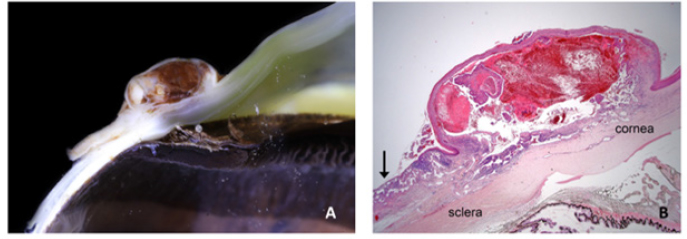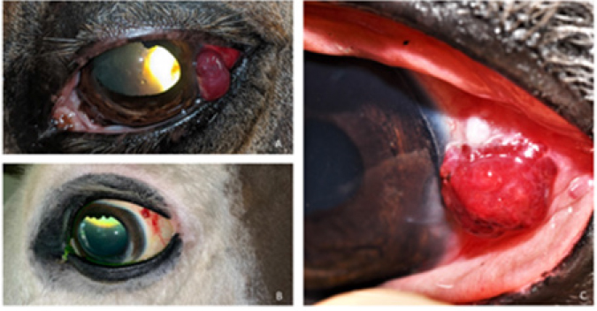 Fig. 2. Bulbar conjunctival haemangiosarcoma gross presentation. (A) Case 2 conjunctival and corneolimbal haemangiosarcoma, (B) Case 6 bulbar conjunctival haemangiosarcoma, (C) Case 5 bulbar conjunctival haemangiosarcoma. Note the exophytic, discrete and lobulated appearance of the tumour. Table 2. Location, surgical procedure performed, and outcome.