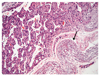 Fig. 5. H&E photomicrograph (100× magnification) of case 2 bulbar conjunctival haemangiosarcoma from a horse characterised by irregularly branching, blood-filled vascular channels. There is evidence of solar elastosis in the conjunctival stroma (arrow). Follow-up and outcomeAll horses were in good health at the last follow-up, which ranged from 2 months up to 5 years, with a mean of 2.9 years (median 2.5 years). Statistical Analysis Due to categorical data and small sample sizes, a Fisher’s exact test was performed with significance set at 95% confidence level (p-value <0.05). Contingency tables were created by comparing pairwise the survival cases number from this work against the survival cases of each study where conjunctival haemangiosarcoma was diagnosed (Table 4) (Hacker et al., 1986; Moore et al., 1986; Bolton et al., 1990; Sansom et al., 2006; Gearhart et al., 2007; Wegge et al., 2010; Pinn et al., 2011; Scherrer et al., 2018). Studies by Wegge and Pinn were excluded from individual calculations due to the sample size consisting of just one case. These were included when comparing our findings to the broader literature (Table 5). DiscussionSurvivalThis study reports a series of five cases of equine ocular haemangiosarcoma and two cases of equine ocular angiosarcoma (with a high suspicion of haemangiosarcoma). All cases were treated surgically, with two cases receiving adjunctive cryotherapy, and had a 100% survival rate at a mean of 2.9 years (34.8 months). This is in contrast to previous studies that demonstrated a high rate of euthanasia rate (73.6%) (Hacker et al., 1986; Moore et al., 1986; Bolton et al., 1990; Sansom et al., 2006; Gearhart et al., 2007; Scherrer et al., 2018). AgeConjunctival haemangiosarcoma appears to be a disease of older horses with an age range in the literature seen from 8 to 25 years old and the average age is 15.2 years (Hacker et al., 1986; Moore et al., 1986; Bolton et al., 1990; Sansom et al., 2006; Gearhart et al., 2007; Arenas-Gamboa and Mansell, 2011; Pinn et al., 2011; Scherrer et al., 2018). In this study, five out of seven horses were categorised as geriatric (aged 15 years or over) (McGowan, 2011). The age range of the horses in the current study was 10–21 years and an average age of 16.2 years. This is consistent with the previous literature (Hacker et al., 1986; Moore et al., 1986; Bolton et al., 1990; Sansom et al., 2006; Gearhart et al., 2007; Wegge et al., 2010; Pinn et al., 2011; Scherrer et al., 2018). The findings of this study, along with the literature, support that conjunctival haemangiosarcoma is a disease of older horses.
