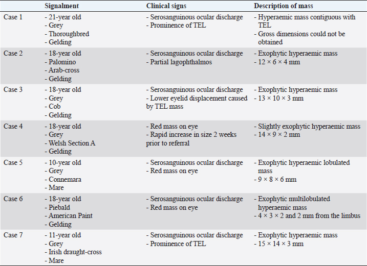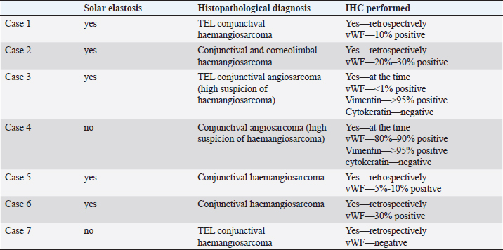 ABSTRACTBackground: Only 27 cases of equine conjunctival haemangiosarcoma have been reported in the literature over the past 37 years. Out of these, 22% of cases were lost to follow-up, 52% were euthanized, and 26% survived. A scarcity of cases and information is available for this rarely seen conjunctival tumour. Aim: To describe the clinical features, management, and outcome of conjunctival hemangiosarcoma in seven horses in the UK. Methods: Optivet medical records were reviewed for equine cases seen or advised on with a histopathological diagnosis of conjunctival haemangiosarcoma between January 2013 and March 2023. Medical records were accessed for details of signalment, history, management, and follow-up. Histopathology was used to confirm the diagnosis of haemangiosarcoma and assess the surgical margins. Immunohistochemistry was performed in a minority of cases with poorly differentiated solid tumours to support vascular lineage. Results: Seven eyes from seven horses (five geldings and two mares) with a mean age of 16 years and median of 18 years (range 10–21 years) met the criteria. Serosanguinous discharge was seen in six eyes. All eyes were managed surgically; 4 by exenteration and 3 by conjunctivectomy/keratectomy. Adjunctive cryotherapy was performed in two eyes. Metastatic disease in the ipsilateral parotid salivary gland, confirmed with histopathology, was seen in one horse. Surgical margins were clear in all but one eye. Solar elastosis was noted in five eyes. All horses were healthy at the last follow-up (0.2–5 years, mean 2.9 years, and median 2 years). Conclusion: Equine conjunctival haemangiosarcoma is rare. Serosanguinous ocular discharge is a common clinical sign. Early surgical excision is highly effective. Solar elastosis is a common histopathological feature, suggesting a role for UV-light in the pathogenesis. Keywords: Haemangiosarcoma, Solar elastosis, Horse, Vascular tumour, Ocular tumour. IntroductionPrimary tumours of vascular origin arise from the endothelium of blood or lymph vessels and can be benign or malignant. The equine eye is rarely affected, and both adnexal and intraocular forms have been reported (Hargis et al., 1978; Bolton et al., 1990). Primary conjunctival vascular tumours have been reported infrequently in several species including the cat (Multari et al., 2002; Pirie and Dubielzig, 2006), dog (Liapis and Genovese, 2004), horse (Vestre et al., 1982; Hacker et al., 1986; Moore et al., 1986; Bolton et al., 1990; Sansom et al., 2006; Gearhart et al., 2007; Wegge et al., 2010; Pinn et al., 2011; Scherrer et al., 2018), cow (Sutton and McLennan, 1982; Ruggles et al., 1992), giant panda (Lopez et al., 1996), and humans (Honavar and Manjandavida, 2015). They originate from the endothelium of blood vessels within the conjunctiva associated with the limbus, the medial and lateral canthus, the third eyelid (TEL) and, rarely, from the cornea. The single report of primary corneal haemangiosarcoma postulated an origin from corneal neovascularization (Lavach and Severin, 1977; Vestre et al., 1982; Hacker et al., 1986; Crawley et al., 1987; Bolton et al., 1990). They are classified histologically as benign (haemangioma) or malignant (haemangiosarcoma) (Knottenbelt et al., 2015). Dogs are the most commonly affected species (Hargis et al., 1978; Pirie et al., 2006), and the lateral bulbar conjunctiva and the leading edge of the TEL are the most frequent locations (Hargis et al., 1978; Peiffer et al., 1978; Peiffer and Terrell, 1978; Pirie et al., 2006). Definitive diagnosis requires histological examination following biopsy (incisional or excisional), and the treatment of choice is surgical excision (Pirie et al., 2006). The prognosis in dogs is good; there is a risk of local recurrence, but metastatic disease has not been reported (Hargis et al., 1978; Peiffer et al., 1978; Peiffer and Terrell, 1978). The most common ocular and adnexal tumour in horses is squamous cell carcinoma (SCC) (Lavach and Severin, 1977; Gearhart et al., 2007; Scherrer et al., 2018); it is also the second most common cutaneous tumour (Sundberg et al., 1977). Other tumours that present in the equine conjunctiva include papilloma, melanoma, mastocytoma, basal cell carcinoma, schwannoma, adenoma and adenocarcinoma, haemangioma, and haemangiosarcoma. Older horses are predisposed (Sansom et al., 2006; Scherrer et al., 2018), and a serosanguinous ocular discharge is the main clinical feature (Sansom et al., 2006; Scherrer et al., 2018). Treatments have included surgical excision, enucleation, exenteration, surgical debulking with adjunctive therapies, radiation alone and euthanasia (Moore et al., 1986; Sansom et al., 2006; Scherrer et al., 2018). Adjunctive therapies included β-irradiation with strontium90, iridium191, brachytherapy, and cryotherapy (Hacker et al., 1986; Moore et al., 1986; Bolton et al., 1990; Sansom et al., 2006). Haemangiosarcoma is rare, with only 27 cases reported over almost four decades since 1986 (Hacker et al., 1986; Moore et al., 1986; Bolton et al., 1990; Sansom et al., 2006, Gearhart et al., 2007; Wegge et al., 2010; Arenas-Gamboa and Mansell, 2011; Pinn et al., 2011; Scherrer et al., 2018). From these 27 cases, six were lost to follow-up (Arenas-Gamboa and Mansell, 2011), 14 were euthanized (Hacker et al., 1986; Moore et al., 1986; Bolton et al., 1990; Sansom et al., 2006; Scherrer et al., 2018), and seven survived (Sansom et al., 2006; Wegge et al., 2010; Pinn et al., 2011; Scherrer et al., 2018). The seven surviving cases were all reported in more recent years (2006 onwards) when the aggressive nature of ocular and periocular haemangiosarcomas was becoming more apparent (Sansom et al., 2006; Wegge et al., 2010; Pinn et al., 2011; Scherrer et al., 2018) and treatment options were advancing. Local recurrence and confirmed metastatic disease to the ipsilateral retropharyngeal lymph node has been reported in one horse (Gearhart et al., 2007); however, further