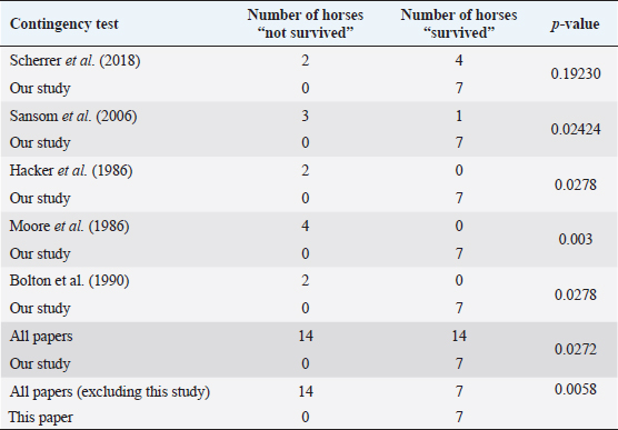 Table 5. Contingency table assessing pairwise survival outcomes from this study to each individual study in the literature and calculated p-values.