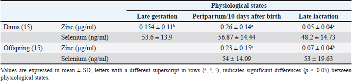 Table 2. Whole blood selenium concentration and serum blood zinc concentration of female alpacas during three physiological states and their offspring.