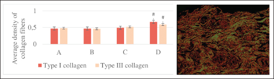 Fig. 3. The average density of types I and III collagen fibers in the skin after 10 days (left). A–control; B–single irradiation, 8 Gy; B–single irradiation, 40 Gy; G–fractional, 78 Gy. #–significant difference (p < 0.05) compared to the control. Group IV dermis stained with picrosirius red in polarized light (type I collagen—red glow, type III collagen—green glow), magn. ×200 (right). Single 40 Gy irradiationMicroscopic analysis Flattening and partial absence of the epidermal basal layer, smoothed dermal papillary layer, dilated blood vessels with erythrocyte sludge, absence of sebaceous glands, intact hair follicles, and subcutaneous fat was noted in group III 10 days after 40 Gy single local electron irradiation. Microcavities of the epidermal-dermal junction, filled with desquamated epidermal cells and polymorphonuclear leukocytes were found (Table 3, Fig. 1B). Three months after a single irradiation at a dose of 40 Gy, we observed partial recovery of the studied morphometric characteristics of the skin and its appendages (Table 4, Fig. 1C). Histochemical analysis According to Masson and safranin staining, we have found that 40 Gy electron irradiation results in moderate outgrowth of the fibrous component of predominantly the papillary dermis (Table 5). Then, we performed a morphometric study of the skin stained with picrosirius red and visualized in polarized light. 10 days after 40 Gy, there was an increase in this indicator compared to the control (Fig. 3). A 40 Gy dose after 3 months led to an increase in the number of mast cells and the density of the fibrous component compared to the control (Fig. 4).