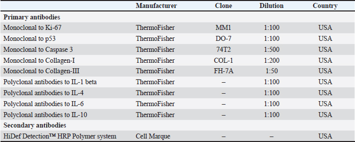 where ∑Nmast cells—the total number of mast cells in all studied fields. Morphometric evaluation after histochemical staining according to Masson and Picrosirius red, and immunohistochemistry (IHC) staining for type I and III collagen fibers was converted into points, taking into account the area and optical density (chromogeneity) in relative units: "1"—weak (0–0.3); "2"–moderate (0.3–0.6); and "3"–pronounced (>0.6). Immunohistochemical studySkin fragments after fixation for immunohistochemical analysis were prepared according to the standard protocol. Characteristics of antibodies are presented in Table 2. Cell nuclei were counterstained with Mayer's hematoxylin. The number of immunopositive cells was counted by three blinded pathologists in 10 randomly selected fields of view at ×400 magnification (in %). The number of collagen fibers in the sections was measured using an image analysis computer program (BMI plus software, BumMi Universe Co.) and expressed as a percentage of the area occupied by collagen fibers in the upper dermis. Stained sections were scored using a modified numerical scale from 0 to 3 (Abramov et al., 2007). Microscopic analysis was performed using a video microscopy system (microscope Leica DM2000, Germany; camera Leica ICC50 HD). Table 2. Primary and secondary antibodies for immunohistochemistry.