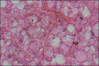 Fig. 3. A–C: Liver tissue of the formaldehyde 37% treated specimens: (V) vacuolation; (BC) blood congestion, (Ne) Necrosis; (H) hepatocyte; SD; (N) Nucleus within hepatocyte (HE × 100).