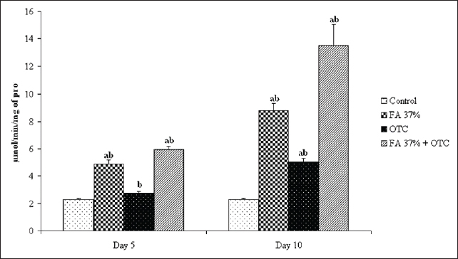 Fig. 5. Catalyse activity in the liver of sea bass control group, sea bass exposed to FA 37% (Formaldehyde), OTC (oxytetracycline), and FA 37% + OTC, respectively. (a) Significantly different from the control at P ≤ 0.05. (b) Significantly different from other treatments at P ≤ 0.05.