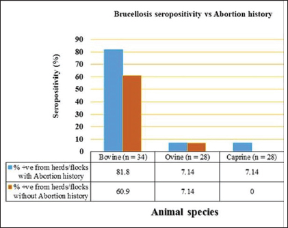 Fig. 6. Herd/flock seropositivity of livestock brucellosis versus history of abortion in Kajiado County.