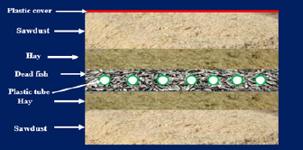 AbstractBackground: Fish producers in Iraq currently facing large and growing problems, represented by the difficulty of getting rid of large numbers of dead fish as a result of mass phenomenon mortality since 2018. As their treatment and disposal have become very cumbersome and costly, and leaving it to wild animals and natural forces is unacceptable, so most of them resort to the composting method because it is a simple, easy, and inexpensive process and benefits outputs, but it takes a long time. Aim: The study aimed to compare two different composting methods for the disposal of dead fish, one of them includes the use of lactic acid bacilli (LAB) to improve composting efficiency. Methods: Sawdust, hay, one-inch perforated plastic tubes, plastic covers, and dead fish were used to make four equal composting piles, two of them were treated with LAB, and others were left to compost naturally, the composted content was daily tested physically for color, odors, pH estimation, and LAB count. Results: The results showed that there are significant differences between normal-composed and LAB-treated groups in duration and efficiency, the total threshold limits of temperature, pH, and LAB count were 60°C ± 8°C, 6.7 ± 0.04, and 10.8 × 106 ± 1.96 CFU/g, respectively, in normal composting groups, while they were 70°C ± 2.8°C, 4.26 ± 0.01, and 23.2 × 106 ± 1.34 CFU/g, respectively, with total decomposition and disintegration of fish carcasses through 31 days in effective microorganisms treated groups. Conclusion: We concluded that the use of LAB in composted materials led to a quick and efficient composting process in terms of heat, pH, LAB count, total disintegration speed, and the ability of biosafety. Keywords: Composting, Dead fish, Lactic acid bacilli, Hygienic disposal, Preserving environment. IntroductionFish and fisheries in general are considered one of the most important sources of food and an important element in achieving the concept of food security, as well as being a main source of national income and one of the supporting ways to local and national economy in large number of countries (Bergmann et al., 2020; Petriki et al., 2021). Therefore, any factor that negatively affects or threatens it in any way will represent a very dangerous matter, given the extent of the damage and the severe negative repercussions on the environment and public health, on this basis, the phenomenon of mass mortality of fish is considered one of the devastating phenomena for fisheries and all sectors benefiting from it (Walli, 2019; Ababneh et al., 2020; Ayilara et al., 2020). Regardless of the location or nature of the area affected by fish mortality, the damage resulting from this death could extend to the sectors of public health, the economy, and the environment, especially with the recurrence of deaths and the extension of damage to organisms other than fish (Alosairi et al., 2021). The possibility of mortality cannot be controlled or predicted; however, the negative environmental, economic, and health impacts resulting from it can be minimized, by taking the necessary health treatments that reduce the degree of pollution by stopping its sources (Kalogianni et al., 2017; Karaouzas et al., 2018). One of the most important methods used in the treatment of dead animals is the composting method, which is a biological reduction process under aerobic conditions, in which organic materials such as dead animals are transformed into soil-like substances in multiple stages, and each stage includes different types of microorganisms and different intermediate products, or its define a biological process similar to a slow cooking process that controls the decomposition of the dead animal’s carcasses and converts the organic materials into other materials, where microorganisms play an important role in this process, through its ability to use nitrogen, fats, and carbon contained in animal carcasses and decompose them at a temperature of 60°C–65°C (Karaouzas et al., 2018; Soe et al., 2022). In the composting process, microorganisms break down organic matter and produce carbon dioxide, water, heat, humus, and a stable organic product. Under ideal conditions, the composting process continues through three phases: mesophilic, or moderate-temperature phase, lasting 2–3 weeks, thermophilic phase, or high-temperature phase, lasting several days to several weeks, and finally the cooling and maturation phase, which lasts for several months (Langston et al., 1997; Allen and Mark, 2003; Kalbasi et al., 2005; Soe et al., 2022). Different types of microorganisms predominate during the different phases of composting, the initial decay is caused by moderate temperature or mesophilic microorganisms that quickly break down soluble materials and decompose easily and produce heat, this causes an increased temperature of composted material rapidly when the temperature rises above 40°C, it will reduce the ability of mesophilic microorganisms to compete and be replaced by high-temperature thermophilic microorganisms that start at a temperature of 50°C and above when the heat reaches more than 60°C, that leading to accelerating the breakdown of protein, fats and complex carbohydrates such as cellulose, hemicellulose, and large structural molecules that are rich in energy, finally the temperature of the mixture begins to decrease gradually and the moderate heat mesophilic microorganisms start working again for processing of maturation of remaining organic matter (Saqib et al., 2004; Li et al., 2018). There are many microorganisms observed during the different stages of the composting process that have been proven to have a significant role in the success of the process, including lactic acid bacteria and bacterial within the dead body, fungi, protozoa, and rotifers (MAF, 1996; Kalbasi et al., 2005; Carter et al., 2007; Soe et al., 2022). The composting process depends on several physiochemical factors, temperature a