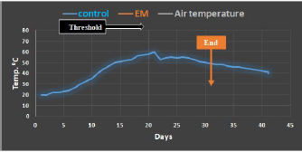 Fig. 1. Components and installation of composting unit. The four composted units were divided into two groups: two of them were left to composted naturally, and the remaining two units were treated (sprayed dead fish layer) with EM after diluting by 10% with distilled water, then enveloped by a plastic cover to keep it from heat loss, rain, and prevent attract flies, rodents, or dogs. The air temperature and compost unit’s components were also fixed at the beginning of the experiment on the 20th of February 2023. Daily follow-up of the experimentThe experiment was conducted on the 20th of February 2023 and lasted a period of 65 days, during which daily regular observation of the composting stages was registered including temperature and pH by using a Professional Portable pH Meter-HI98163/Hanna Instruments® USA (designed to measure temperature and value of pH together), and LAB Count. After 3 weeks the composted units were flipping to increase porosity, and then supervision of the experiment for both methods was continued until the end. LAB countTo perform LAB count, 50 g of fermented materials were collected from various places and randomly from each pile of the experiment groups, were placed in sterile containers and transported directly to the scientific research laboratory in the College of Education for Girls at Tikrit University to conduct bacteriological tests on them. MRS agar (Newgen®/USA) was used for the LAB count present in the composted piles of each group. Serial dilutions were made in deciliters and cultured on plates. The culture was incubated under anaerobic conditions at 37°C for 48 hours. Bacterial counts were achieved according to Kangawa et al. (2018). The LAB count was performed after the first week of starting the experiment and returned every 4 days until the maturation phase was completed. statistics analysisThe T-test was used to measure the differences between experimental groups’ means at a significant level of p < 0.05 (Petrie and Watson, 2013). Ethical approvalNot needed for this study. ResultsThe results of our experiments showed that there are clear differences in the course of the composting process for both methods (normal composting and EM treated) in terms of time, fermentation speed, and process efficiency. The composting process by LAB (EM) was more raped, with higher temperature, and more stabilized in the second phase of composting where it reached 70°C ± 2.4°C compared to the normal composting groups, which amounted to 60°C ± 4°C.