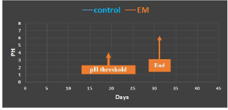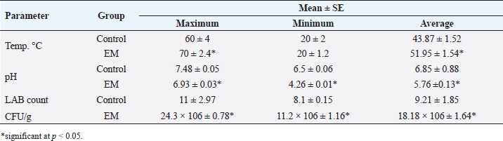 Mahmud et al. (2015). indicated that to achieve the condition of the composting process, the temperature must rise in the first phase, specifically during the first days, to reach 40°C to 45°C to reach their threshold, and then start the second phase of the composting process, which is the high-temperature stage where the temperature reaches 60°C, which is very important in composting success. This was evident in the results of our study by reaching EM groups to the second phase in less time compared to the normal composting groups. The LAB showed a higher growth pattern than the patterns naturally found in the carcasses of dead fish, where the growth was according to the need for nutrients and their ability to use nitrogen and other nutrients resulting from protein decomposition. nutrients, heat, and deodorization of gases resulting from the composting process, thus preventing the arrival of insects, birds, and disease vectors over dead bodies, and thus reducing the spread of diseases. This matches what the researchers reported (Lopez-González et al., 2015; Mahmud et al., 2015; Villar et al., 2016). The degrading enzymes produced by the LAB work to break down keratin and other proteins in the scales and skin, which yield carbon, sulfur, and energy, which are used by the bacteria for growth and sustainability (Burtt, 1999). LAB patterns are present everywhere and they can grow on natural media without any special needs, this feature is used to break down organic matter in large quantities, moreover, LABs are thermophilic microorganisms that prefer high temperatures, this property is also used to control the process of rapid and efficient breakdown of scales, skin, and tissues, as confirmed by researchers (DeRouchey et al., 2005; Taher and Tabbaa, 2012). In addition to the enzymes that break down complex molecules such as keratin, which are among the many enzymes that are widely used in the chemical, medical, and animal feed industries (Ichida et al., 2001). The addition of LAB (EM) played a role in increasing the numbers of LAB, which was reflected in a faster digestion and disintegration process with higher temperatures compared to normal composting groups. The temperature in the group that was treated with the LAB reached more than 70°C, which is an ideal and preferred temperature because it leads to accelerates the process of decomposition and disintegration of tissues and the exclusion of other bacterial species that cause decay and killing larvae of flies and other insects that transmit diseases, and this what Yoon et al. (2019) explained. According to researchers (Tabbaa and Taher, 2009; Taher and Tabbaa, 2012; Mahmud et al., 2015), the pH is very important for the microorganisms in the composting processes in several directions through helping to accelerate the digestion of organic materials and the production of organic acids in the early stages of composting, that lead to encourage the growth of fungi that destroy the remaining complex materials that bacteria cannot break down as they grow and spread with many cells and hairs and attack the dry and acidic organic residues and break down lignin and cellulose. This was evident in the results of the current study by decreasing the pH value of LAB composting, which was like a slow cooking process, compared to the normal composting groups. This improvement in the composting process is due to the increase in the number of synergistic microorganisms formed in the natural bio-product LAB, which was evident through the ratio of LAB number, which constitutes 80% of the components of the LAB, and had the greatest effect on the course of this process in terms of time, speed of disintegration, decomposition, and maturation. Therefore, adding LAB-producing enzymes that decompose organic matter is considered a ways to dispose of organic matter and animal carcasses, as the results encourage belief in using LAB to treat other types of waste to preserve the environment from various pollution problems. ConclusionWe concluded that the using of LAB(EM) in the composted materials from dead fish carcasses led to a quick and efficient composting process in terms of temperature, pH, LAB count, total disintegration speed, and the ability of biosafety to eliminate pathogens. Because of their significant impact on the composting period and reducing the composting time. The pH of composted materials, where the composting process changed as a result of acid digestion of dead fish, thus disintegration and digestion faster. In our experiment, we obtained a complete digestion and dissolution of the dead fish in 31 days. AcknowledgmentThe researchers extend their deep thanks and great gratitude to the Deanship of the College of Education for Girls, Tikrit University, and to the Deanship of the College of Veterinary Medicine, University of Mosul, for the unlimited support to complete this work. Conflict of interestThe authors declare that there is no conflict of interest. FundingSelf-funding. Authors contributionsThe experiment was designed and the manuscript was written by Abed Erdeni and Dhyaa Jwher. Muntaha Hassan and Dhamyaa Al-Doory participated in the work by monitoring the experiment and analyzing the data. Data availabilityAll data supporting the findings of this study are available within the manuscript. ReferenceAbabneh, M., Hananeh, W. and Alzghoul, M. 2020. Mass mortality associated with koi herpesvirus in common carp in Iraq. Heliyon 6(8), 4827–4830. Allen, F.H. and Mark, J.E. 2003. Composting for mortality disposal on hog farms, Virginia tech tidewater. Agricultural Research and Extension Center, Virginia State, USA, pp: 414–420. Alosairi, Y., Al-Ragum, A. and Al-Houti, D. 2021. Environmental mechanisms associated with fish kill in a semi-enclosed water body: an integrated numerical modeling approach. Ecotoxicol. Environ. Saf. 217, 112238. Ayilara, M., Olanrewaju, O., Babalola, O. and Odeyemi, O. 2020. Waste management through composting: c