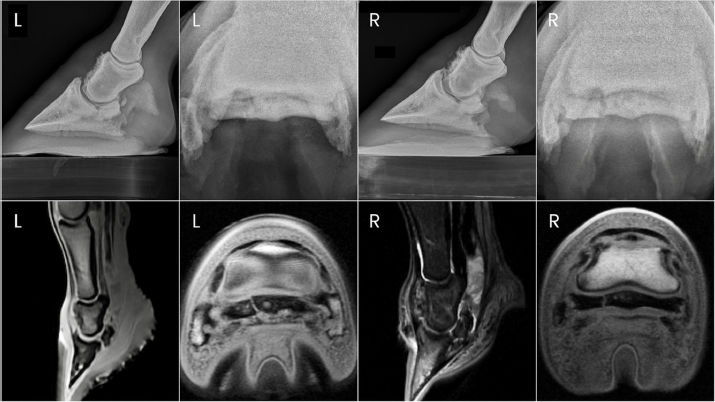 Fig. 3. Antemortem radiographs and postmortem MRI images of horse one showing bilateral navicular bone fractures, DIPJ hyperextension, and DDF tendon compromise.