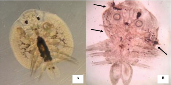 Fig. 1. Feature of a fish parasite in goldfish under stereoscopic microscopy. (A) Lived organism with mobility. (B) No movement of dead organisms with incomplete physical appearance (arrows). Ethical approvalThe Animal Care and Committee of the Faculty of Veterinary Medicine, Chiang Mai University (FVM-ACUC) (Process number: R17/2557), approved the investigation for use in animal studies. ResultsPlant material and chemical analysis of the essential oilThe extraction yield was 0.7% of the weight of the raw turmeric rhizome. Observed against a white background, turmeric essential oil possessed a fluid consistency and a pale yellow color. In addition, the extracted oil was liquid at ambient temperature. The GC-MS study found that the extracted essential oil of turmeric had a wide range of chemical components. A comprehensive number of components were identified in the extracted oil. The GC-MS chromatogram presented in Figure 2 exhibits a substantial number of peaks, each characterized by distinct chemical constituents. The extracted essential oil contained b-turmerone (39.64%) and alpha-turmerone (13.87%) as the primary chemical components, as indicated in Table 1. In addition, the compounds ar-turmerone, alpha-zingiberene, and beta-sesquiphellandrene were identified, with respective concentrations of 5.87%, 4.13%, and 4.03%. In vitro testThe results of effectiveness testing of different concentrations of turmeric oil, which were 12.5, 25, 50, 100, and 200 ppm, and control vehicles against the Argulus spp. parasite are presented in Figure 3. In the in vitro test, 200 pp m of turmeric oil performed the highest antiparasitic activity of up to 100% and killed Argulus spp. in 180 minutes. Furthermore, 50 and 100 ppm of essential oil revealed an antiparasitic efficacy of up to 100% and killed in 1,080 and 360 minutes, respectively. However, during observation time, the mean mortality rate (%) in the 12.5 and 25 ppm turmeric oil groups was 36.66 ± 25.16 and 93.33 ± 5.77, respectively. In addition, the antiparasitic efficacy of Neguvon® (the positive control) group showed 86.66 ± 23.09 in 1,440 minutes. Finally, after 24 hours, the results of the clean water group and the DMSO group were 3.33 ± 5.57. In vivo testThe toxicity of turmeric essential oil was determined at 12.5, 25, 50, 100, and 200 ppm. We found the safe dose of the working solution to be 12.5 ppm. At this concentration, there was a significantly higher antiparasitic effect than in the negative control and the vehicle control (p < 0.05). Thus, this concentration was selected to apply in the next experiment. In vivo antiparasitic efficac y testing demonstrated on infected fish that soaking with 12.5 ppm of turmeric essential oil, dimethyl sulfoxide, and Neguvon® resulted in the results shown in Figure 4. During the observation period, the Neguvon® group achieved the highest percentage decrease in Argulus spp. infection in treatment, 94.69 + 0.003. However, 12.5 ppm of essential oil presented 62.83 ± 0.004 of antiparasitic efficacy (%). DiscussionCurcuma longa L., commonly known as turmeric, was native to tropical South Asia but is now generally harvested in tropical regions of the world. It was botanically related to the Zingiberaceae family (Kim et al., 2013; Setyaningsih et al., 2019; Mitsuwan et al., 2020; Kumar et al., 2022). The role of essential oil from the rhizome of turmeric performed various pharmacological properties in terms of antibacterial, antiviral, and antiparasitic activities for treating disease in humans and animals (Méndez et al., 2016; Martinez-Correa et al., 2017; Singh et al., 2017; Sornpet et al., 2017). The percentage yield in essential oil extraction in this study was 0.7% of the weight of fresh turmeric rhizome. Similarly, some studies in India have reported that C. longa L. essential oil in fresh rhizomes yields between 0.37% and 0.8% in different agroclimatic zones (Sandeep et al., 2016), and between 0.61% and 1.45% in the northern part of the country (Garg et al., 1999). Furthermore, Pino et al. (2018), who studied in Amazonian Ecuador, revealed the percentage yield of essential oil in fresh rhizomes was 0.8%. On the other hand, the percentage yield of essential oil that was extracted from dry turmeric rhizome in the USA varied from 1.5% to 5.0% (Li et al., 2011). Moreover, the researchers in Brazil reported a percentage yield of essential oil from dry rhizomes between 3.0% and 5.16% (Guimarães et al., 2020). To date, the chemical compositions in turmeric oil have been investigated and generally contain primarily phenolic compounds and terpenoids, including diarylheptanoids (including those commonly known as curcuminoids), monoterpenes, sesquiterpenes, diterpenes, triterpenoids, alkaloids, and sterols. This present research detected turmerone (59.38%) as the major compound in the extracted oil from fresh rhizomes. Our results were in agreement with previous studies by Pino et al. (2018), who reported that turmerone (58.9%) was the most represented class of volatiles from rhizomes grown in Amazonian Ecuador, including ar-turmerone (45.5%) and alpha-turmerone (13.4%). Similar results were performed by Jaiswal and Naik (2021), Guimarães et al. (2020), Intirach et al. (2012), and Devkota and Rajbhandari (2016), whose data indicated that 58%, 50.05%, 49.21%, and 25.93% of turmerone were revealed as the major constituents, respectively. Nevertheless, the previous research presented the other compounds as the major components in the essential oil, including from fresh rhizomes in Brazil (11% zingiberene) (Gonçalves et al., 2019), from plants cultivated in Korea (27.70%–36.75% alpha-zingiberene) (Hwang et al., 2016), from raw materials grown in Sri Lanka (18.2% alpha-phellandrene) (Herath et al., 2017), and from herbs in Nigeria (13.9% beta-bisabolene) (Usman et al., 2009). In numerous previous studies presented, several factors could interfere with the percentage yield of essential oils and the che