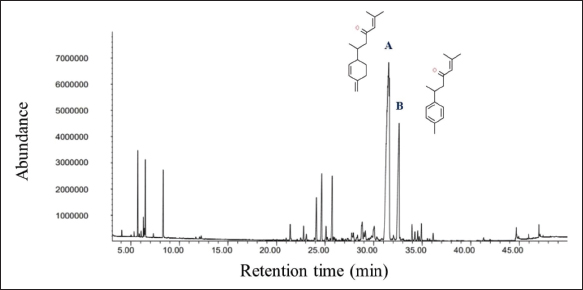 Fig. 2. GC-MS chromatograph for essential oil isolated from Curcuma longa L. Chemical structures of the two major constituents identified from the turmeric essential oil, including (A) b-turmerone and (B) ar-turmerone. Table 1. Chemical composition of essential oil from Curcuma longa L. obtained by GC-MS analysis. The turmeric oil was extracted from the rhizomes of Curcuma longa L. by simultaneous hydro-distillation and analyzed by GC-MS. RT: Retention time.