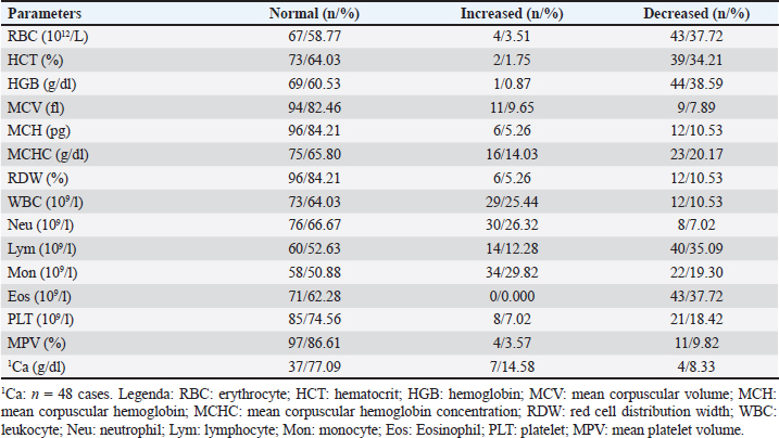 AbstractBackground: Canine lymphoma is the most common hematopoietic cancer in dogs. Numerous studies have evaluated the prognostic value of hematological abnormalities and ratios in both humans and dogs with lymphoma. Aim: To compare hematological parameters and complete blood count ratios between a population of dogs affected by lymphoma and healthy dogs to identify potential prognostic markers for lymphoma. Methods: This retrospective case-control study compares hematological parameters and complete blood count ratios between a population of 114 dogs affected by multicentric large B-cell lymphoma (LBCL) and 60 healthy dogs. Results: The study found several statistically significant differences between the hematological indices of LBCL dogs and healthy dogs, but no correlation between these parameters and the survival times of 78 dogs treated with chemotherapy Madison Wisconsin protocol. In addition, hematological alterations were evaluated such as anemia, leukocytosis, and thrombocytopenia. Conclusion: Hematological ratios have been suggested as potential prognostic markers for canine LBCL but their real prognostic value remains controversial and requires future investigation. Keywords: Dogs, Lymphoma, CBC, Indices, Ratios. IntroductionCanine lymphoma is the most prevalent hematopoietic malignancy in dogs. This term encompasses a group of heterogeneous diseases that differ in clinical presentation, immunophenotype, and prognosis (Valli et al., 2013; Zandvliet, 2016; Antognoni et al., 2021; Magni et al., 2023). Canine Lymphoma is a correspondent to non-Hodgkin Lymphoma in humans. Large B-cell lymphoma (LBCL) is the most frequent immunophenotype of multicentric lymphoma in dogs. Typically, lymphoma is diagnosed in middle-aged or dogs older than 10 years. Although no significant gender predisposition has been demonstrated, spayed females appear to have an increased risk (Zandvliet, 2016). The most widely used therapy for canine lymphoma consists of a multidrug combination (CHOP-based protocol) of cyclophosphamide, doxorubicin, vincristine, prednisone, and l-asparaginase without maintenance further therapy. The neoplasm is extremely aggressive, with a median survival time under treatment of approximately 8–10 months in dogs with LBCL (Bienzle and Vernau, 2011; Valli et al., 2013; Zandvliet, 2016). Many prognostic factors have been considered significant for LBCL, including clinical symptoms, stage, histological aspects, grade, proliferation markers, and response to treatment (Zandvliet, 2016; Davies et al., 2018). Given the aggressive behavior of LBCL, prognostic markers that allow monitoring the course of the disease in an easy, repeatable, and inexpensive way, are of critical importance. Many studies have focused on hematological parameters as potential prognostic markers. The hematologic examination is a minimally invasive procedure available to all veterinary clinicians, and it is routinely executed before chemotherapy administration. Several hematological parameters both in human and veterinary medicine have been proposed as prognostic markers for many different diseases, including vascular (Balta et al., 2016), degenerative (Wan et al., 2020), and inflammatory diseases (Neumann, 2021), as well as different types of tumors, such as soft tissue sarcoma (Macfarlane et al., 2016), laryngeal carcinoma (Yılmaz et al., 2018), acute myeloid leukemia (Zhang et al., 2021), and lymphomas (Henriques et al., 2021), and others. The possibility to use neutrophils/lymphocytes ratio (NLR) as an independent prognostic factor has been investigated in human patients with LBCL. To date, a high NLR value has been found to be associated with poor overall survival and poor progression-free survival. At the time of diagnosis, an NLR cut-off value of 3 has been reported in one study (Wang et al., 2017), and 3.5 in another (Porrata et al., 2010). This association between a high NLR and poor prognosis may be related to the production of inflammation mediators, resulting in immunosuppression and a reduction in the patient’s immune efficacy. In addition, a high platelets/lymphocytes ratio (PLR) appears to be correlated with a worse clinical condition of the patient and a poor prognosis in human LBCL, as reported by a 2019 meta-analysis study (Chen et al., 2019). In veterinary medicine, the predictive value of platelets/neutrophils ratio (PNR), NLR, and the level of anemia as prognostic factors in dogs with a diagnosis of LBCL has been suggested. Patients with a higher PNR above 0.032 showed earlier disease progression than others, while patients with NLR above 7.5 showed a higher mortality rate at 180 days (Henriques et al., 2021). On the other hand, several studies in both human and veterinary medicine have failed to demonstrate a statistically significant association between NLR and overall survival or progression-free survival (Mutz et al., 2015; Azuma et al., 2019). In humans, multiple studies have identified higher red blood cell (RBC) distribution width (RDW) as a negative prognostic factor in patients with LBCL (Zhou et al., 2017; Ai et al., 2018; Hasan and Elmeshhedany, 2021). In dogs, the prognostic value of this index has been investigated for a few diseases (Guglielmini et al., 2013, 2021, 2022; Garcia-Arce et al., 2022; Miglio et al., 2023) and only one study considered LBCL (Martinez et al., 2019). Furthermore, to date, the red blood cell distribution width to total serum calcium ratio (RDW/Ca) has been investigated and suggested as a ratio of prognostic relevance only in patients with acute pancreatitis, in both humans (Gravito-Soares et al., 2018; Han et al., 2021) and canine species (Guglielmini et al., 2022). However, the prognostic value of these hematological ratios in canine LBCL remains controversial and under investigated. Most of the existing studies conducted on this topic lack a control group of healthy patients for comparison. The main objective of the study is to assess the role o