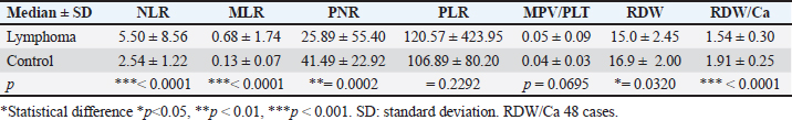 Table 3. Ratio and indexes in healthy and DLBCL dogs.