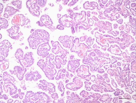 Fig. 3. ELST. Neoplastic cells grow forming papillary projections lined by one to two layers of polygonal cells and supported by a delicate fibrovascular stroma (H&E stain; scale bar=100 µm).
