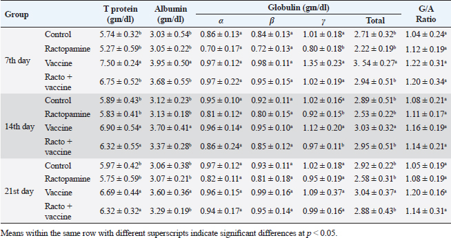 Table 4. The effect of ractopamine on protein picture in rabbits vaccinated with RHD virus vaccine (mean ± SE) (n=5).