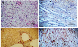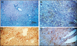 Fig. 2. Photomicrograph of peroxidase stained rabbit A) liver and B) kidney of group 3 showing negative expression for caspase-3 (scale bar=100 µm), C) liver of group 4 showing diffuse positive moderate expression for caspase-3, and D) kidney of group 4 showing focal interstitial moderate expression for caspase-3 (scale bar=100 µm).