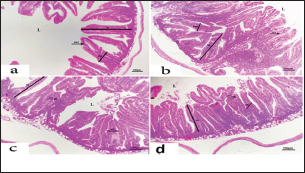 Fig. 3. Photomicrograph of intestine portions of different groups at first scarification showing mucosal demonstration for VL; VW and Goblet cells (GCC) for groups a–d consequently (H&E X bar=100 µm).