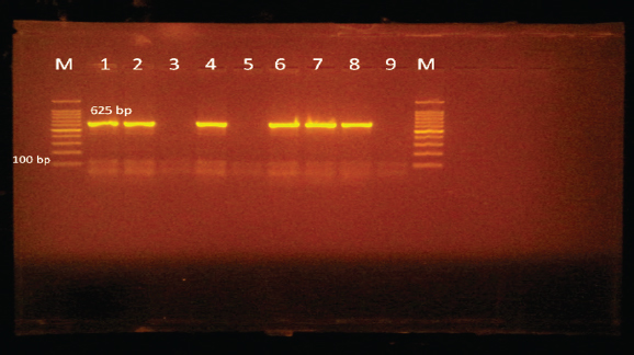 Fig. 2. Agarose gel electrophoresis of PCR products of 16S rRNA (625 bp) as species specific gene for confirmation of A. hydrophila isolated from O. niloticus. Lane M: 100–1,000 bp. DNA Ladder. Lane (1,2,4,6&7): positive A. hydrophila strains. Lane (3&5): negative A. hydrophila strains. Lane 8: positive control for A. hydrophila (at 625 bp). Lane 9: negative control for A. hydrophila.