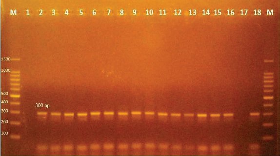 Fig. 4. Agarose gel electrophoresis of PCR products of Sin1, Sin2 (300 bp) virulence genes for characterization of S. iniae. Lane M: 100-bp DNA ladder. Lane (2–16): positive S. iniae. Lane (1): negative S. iniae . Lane (17): negative control S. iniae. Lane (18): positive control S. iniae (300 bp). Table 4. Antibiotic sensitivity for A. hydrophila, Vibrio sp., and S. iniae.