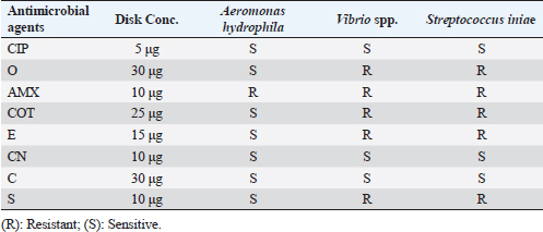ABSTRACTBackground: The high summer mortality in many fish farms, which had detrimental economic and social implications, was a serious challenge that the fish industry had to deal with. Aim: With an examination of the most effective antibiotic, the ongoing research was intended to shed light on the identification of the main bacterial pathogens associated with the summer mortality syndrome in the diseased farmed Nile tilapia. Methods: Six hundred dead Nile tilapia samples that had suffered from summer mortality were collected from several fish farms between May and October of 2022. The gathered fish displayed hemorrhagic areas on the skin, scale detachment, fin degeneration, erosions, skin ulcers, and corneal opacity with unilateral and/or bilateral exophthalmia. The most prominent internal appearance was swelling of the internal organs with sanguineous ascetic fluid. Results: There were 225 bacterial isolates found. Six species were identified through phenotypic and biochemical analysis; they were Aeromonas, Vibrio, Streptococcus, Pseudomonas, Enterococcus, and Edwardsiella spp., in descending percentage, respectively. Aeromonas spp., Vibrio spp., and Streptococcus spp. were the three most frequent isolated bacterial pathogens. The identification of Aeromonas hydrophila, Vibrio spp., and Streptococcus iniae, the three most common bacterial isolates, was confirmed by molecular analysis by polymerase chain reaction. Most of the tested strains were found to be responsive to Ciprofloxacin (CIP), Gentamicin (CN), and Chloramphenicol (C) but resistant to Amoxicillin (AMX), according to an antibiotic sensitivity test. Conclusion: The three most dangerous common bacterial infections discovered during mass-farmed tilapia summer mortality are A. hydrophil a, Vibrio sp., and S. iniae. This makes it clear that high water temperatures may raise the possibility of bacterial infections, which could cause widespread tilapia mortality and substantial financial losses. Therefore, it is crucial to maintain a beneficial fish culture, environment, and husbandry practices to enhance the tilapia-rearing environment and lessen the virulence of the disease. Isolated bacterial strains showed low levels of resistance to AMX but were vulnerable to CIP, CN, and C. Keywords: Aeromonas hydrophila, Nile tilapia, Streptococcus iniae, Summer mortality, Vibrio sp. IntroductionAquaculture is now one of the most crucial methods for supplying the market because natural fisheries have been badly depleted and are no longer a reliable source of protein for humans (Mohamed et al., 2017; Adelekea et al., 2021). According to Reda et al. (2021), Egypt is the world’s third-biggest tilapia manufacturer and the aquaculture leading supplier in Africa. In addition to serving as an excellent provider of protein, tilapia is regarded as one of the essentials to ensuring the security of food, especially in densely inhabited nations like Egypt (Hussain et al., 2011; Abbas et al., 2017; El-Sayed, 2019). Moreover, many young individuals find employment in this sector as a means of support (Dickson et al., 2016). Extensive fish farming is unfortunately plagued by plenty of issues, such as diseases, that discourage farmers because of the financial penalties (Eltholth et al., 2015). Summer high mortality in several aquaculture facilities and the Nile Delta, which has had detrimental economic and social impacts, has been a key concern for this industry since 2013 (Fathi et al., 2017; Ali et al., 2020). The agents responsible for these outbreaks have been traced in several trials. Studies have revealed a number of variables, such as bacterial, fungal, viral, and parasitic causes, that may contribute to tilapia mortality (Yambot, 1998; Ye et al., 2011; Eissa et al., 2015; Fathi et al., 2017; Nicholson et al., 2020; Youssuf et al., 2020). Under stressed conditions, farmed Nile tilapia is vulnerable to several pathogenic microorganisms (Shaheen et al., 2013; Eissa et al., 2015). The most common cause of the large annual losses in the fish farming industry, which are projected to be worth billions of dollars (Elsheshtawy et al., 2019; Algammal et al., 2020), has been identified as bacterial infections. When water temperatures rise, opportunistic microorganisms in particular represent a serious threat to aquaculture (Pridgeon and Klesius, 2012). The potential for a bacterial infection to result in extensive fish mortality is a complex situation, and many aspects linked to the environment, host, and microbes may collaborate to show the progression of diseases (Harvell et al., 1999). Moreover, disease outbreaks may be sparked by environmental factors including temperature, salinity, oxygen level, and pH, especially throughout intensive aquaculture systems (Eissa et al., 2013). Due to the serious practices involved in fish farming, infectious illnesses constitute the main issue in aquaculture facilities and have a significant financial impact (Bulfon et al., 2015). Aeromonas veronii biovar sobria infection was linked to widespread deaths of cultured tilapia in the El-Sharkia governorate (Eissa et al., 2015; Elsheshtawy et al., 2019; Reda et al., 2021). However, Fathi et al. (2017) linked these fatalities to tilapia lake virus infection. According to Fang et al. (2004), Aeromonas is a dangerous disease that has the potential to spread internationally and produce epidemics in fish farming with extraordinarily high fatality rates. Aeromonas spp. are facultatively anaerobic, Gram-negative, oxidase-positive bacteria, according to Stratev and Odeyemi (2016). Aeromonads can be found in several kinds of foods, including fish, prawns, mussels, milk, meat, and vegetables, according to Neyts et al. (2000). They are frequently found in the aquatic environment. In tilapia farming, Aeromonas hydrophila has been found to be the most abundant species Hassan et al. (2017). Several Vibrio species are also widely recognized for their capability to lead to serious fish di