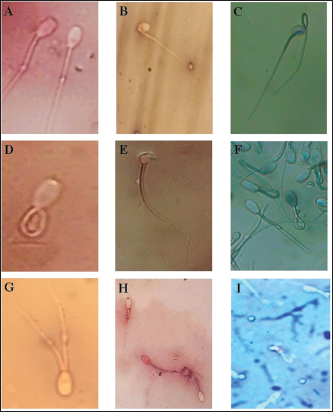 Fig. 2. Microscopic detection of abnormal sperms shows (A): Acrosome defect, (B): Bent neck defect, (C): Double tail, (D): Coiled tail, (E): Irregular head defect, (F): Piriform, (G): Double tail, (H): Plasia sperm, and (I): Tape head.