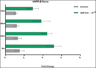 Fig. 8. Expression of hNPR-B gene in control and CNP-sperm samples during three days of cooling preservation. DiscussionFor years, semen cryopreservation that comprises different cooling and freezing steps has been a valuable procedure for the application of reproductive technologies such as artificial insemination, in vitro embryo production, and embryo transfer since it eliminates the limitations of time and space (Dias et al., 2018). In Iraq, the field studies have focused on the significant influence of the quality of thawed semen of bulls with a consequence of variable success rates (Al-Daraji et al., 2002; AL-Badry, 2016; Hussain et al., 2016; Saleh, 2019; Alhelal and Abdulkareem, 2023); whereas globally, the effect of storage or cooling rates on fertility of semen suspension was studied in different domestic and wild animals such as buck (Ahmad et al., 2015), stallion (Cuervo-Arango et al., 2015), cattle (Dias et al., 2018), donkey (Zhang et al., 2018), llama (Zampini et al., 2020), and dog (Colombo et al., 2022). Therefore, different additives have been used to improve the physical quality of sperms such as arginine (AL-Ebady et al., 2012), caffeine (Shahad et al., 2020), and silymarin (Ali et al., 2022). In this study, the effect of CNP on cooled sperms of rams was studied for the first time in Iraq, and the results revealed that the lowered concentration of CNP revealed the suitable dose of sperms suspension could be used for artificial insemination of ewes. Worldwide, a number of studies have been performed to detect the effect of CNP on normal human sperm (Xia et al., 2016), sperm attraction for fertilization (Kong et al., 2017), regulation of sperm capacitation in the genital tract of female rats (Wu et al., 2019), anti-inflammatory role in rat epididymitis (Mei et al., 2021), sperm motility and reproduction function of azthenozoospermia in mice (Li et al., 2022), and spermatozoa maturation in rats (Zhao et al., 2023); however, no data were available concerned with the toxicological effect of CNP on sperms. Microscopic examination of sperms suspension treated with the suitable dose of CNP (0.01 ´ 10-13) showed that there were significant decreases in levels of individual motility, live sperms, and sperm concentration with advancing the periods of cooling when compared to control, but abnormal sperms were increased more significantly in control compared to CNP. For the turbidimetric analysis, values of lag time, motility index, velocity, and FRMS showed that the impact of cooling on sperms suspension treated with CNP was lowered in comparison with that detected in sperms samples of control. Various studies suggested that mouse NPs, including CNP, can exhibit chemoattractant features with the ability to attract mammalian spermatozoa and increase sperm motility (Zamir et al., 1993; Bian et al., 2012). Xia et al. (2016) showed that CNP can induce a significant dose-dependent increase in spermatozoa motility and acrosome reaction, thus, regulating the reproductive function of males. Kong et al. (2017) reported that CNP can increase the levels of intracellular cGMP and Ca+2 of spermatozoa and induce sperm accumulation by attraction. Özbek et al. (2019) observed the CNP expression in the epithelial and smooth muscle cells of epididymis, suggesting that CNP can increase the motility of spermatozoa in epididymis via cGMP. Wu et al. (2019) concluded that CNP secreted by the female genital tract might bind to spermatozoa and stimulate successively the intracellular cGMP/PKG signaling by increasing the Ca+2 and tyrosine-phosphorylated proteins, promoting hyperactivation and inducing the acrosome reaction which ultimately facilitated sperm capacitation in the genital tract of female rat. Mei et al. (2021) showed that the semen samples of asthenospermia patients have a lower concentration of CNP than normal people, with an observable activity in improving the motility of sperm and alleviation of cyclophosphamide damage to sperm motility and reproductive system. Similar findings were recorded by Li et al. (2022) who found that CNP alleviates the acute epididymitis injury and decreases invasion and inflammatory reaction of macrophages; suggesting the possibility of using CNP as a potential treatment for epididymitis. Zhao et al. (2023) found that CNP plays a role in epididymal sperm maturation as it promotes the acquisition of epididymal sperm fluidity. Based on PCR analyses at different times of cooling intervals, the findings of the current study showed that the expression of the hNPR-B gene was elevated significantly in CNP samples in comparison with controls. Our findings are in agreement with those demonstrated by other researchers (Ueda et al., 2020; Yu et al., 2021; Nakagawa and Nishikimi, 2022). NPR-B is a guanylate cyclase-linked receptor that appears to be activated CNP (Pagel-Langenickel et al., 2007). Lu and Pan (2017) concluded that CNP can elicit exercise preconditioning-induced protection against tissue injury via the up-regulation of NPR-B receptors. Zhao et al. (2023) recorded a significant increase in the expression of AKAP4, Bin1b, CD52, Dnah17, and LDCH genes in semen samples incubated with CNP; suggesting that, CNP could initiate epididymal motility and regulate the expression of sperm motility and mature-related genes. ConclusionThis study, done for the first time in Iraq, highlights the important role of CNP in improving the physical properties of ram epididymal sperms while increasing the expression of the hNPR-B gene that might play a role in treating growth failure. However, changes that occur after excessive exogenous CNP exposure remain to be clarified, and the toxicological profile of the CNP and its derivatives has required furthermore supplements. AcknowledgementsThe authors thank the Department of Surgery and Obstetrics in the College of Veterinary Medicine (University of Baghdad) for providing all facilities and support throughout carrying out this study. 